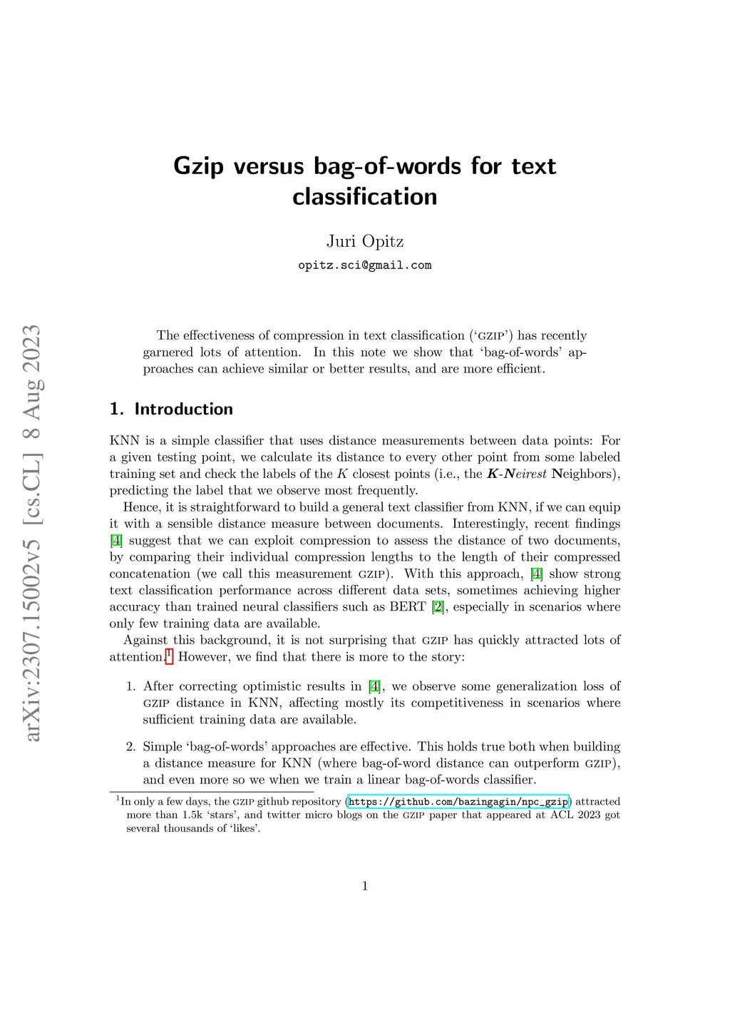 The effectiveness of compression in text classification ('gzip') has recently garnered lots of attention. In this note we show that `bag-of-words' approaches can achieve similar or better results, and are more efficient.