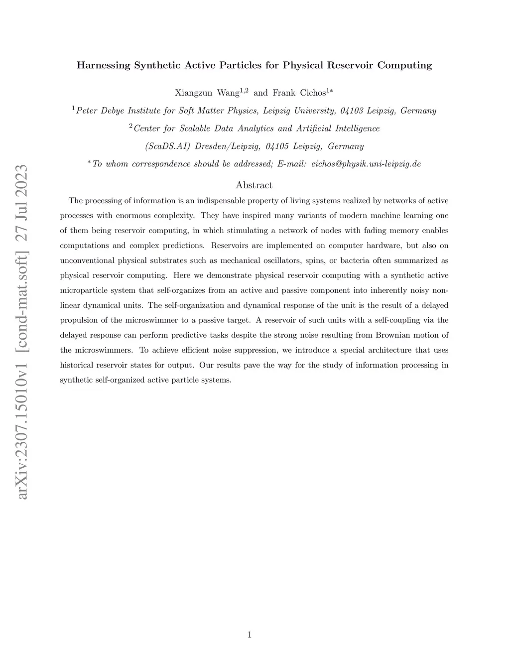 The processing of information is an indispensable property of living systems realized by networks of active processes with enormous complexity. They have inspired many variants of modern machine learning one of them being reservoir computing, in which stimulating a network of nodes with fading memory enables computations and complex predictions. Reservoirs are implemented on computer hardware, but also on unconventional physical substrates such as mechanical oscillators, spins, or bacteria often summarized as physical reservoir computing. Here we demonstrate physical reservoir computing with a synthetic active microparticle system that self-organizes from an active and passive component into inherently noisy nonlinear dynamical units. The self-organization and dynamical response of the unit is the result of a delayed propulsion of the microswimmer to a passive target. A reservoir of such units with a self-coupling via the delayed response can perform predictive tasks despite the strong noise resulting from Brownian motion of the microswimmers. To achieve efficient noise suppression, we introduce a special architecture that uses historical reservoir states for output. Our results pave the way for the study of information processing in synthetic self-organized active particle systems.