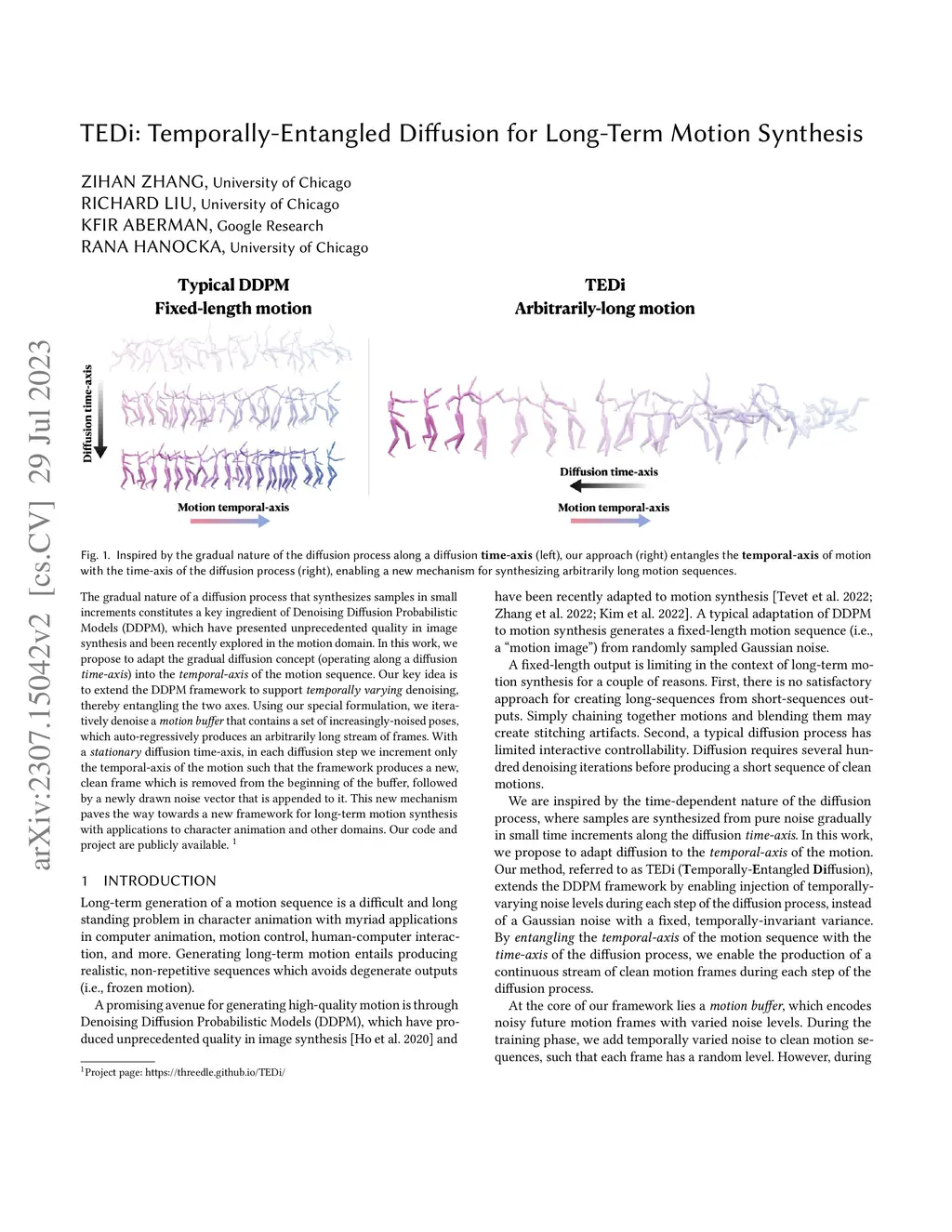 The gradual nature of a diffusion process that synthesizes samples in small increments constitutes a key ingredient of Denoising Diffusion Probabilistic Models (DDPM), which have presented unprecedented quality in image synthesis and been recently explored in the motion domain. In this work, we propose to adapt the gradual diffusion concept (operating along a diffusion time-axis) into the temporal-axis of the motion sequence. Our key idea is to extend the DDPM framework to support temporally varying denoising, thereby entangling the two axes. Using our special formulation, we iteratively denoise a motion buffer that contains a set of increasingly-noised poses, which auto-regressively produces an arbitrarily long stream of frames. With a stationary diffusion time-axis, in each diffusion step we increment only the temporal-axis of the motion such that the framework produces a new, clean frame which is removed from the beginning of the buffer, followed by a newly drawn noise vector that is appended to it. This new mechanism paves the way towards a new framework for long-term motion synthesis with applications to character animation and other domains.