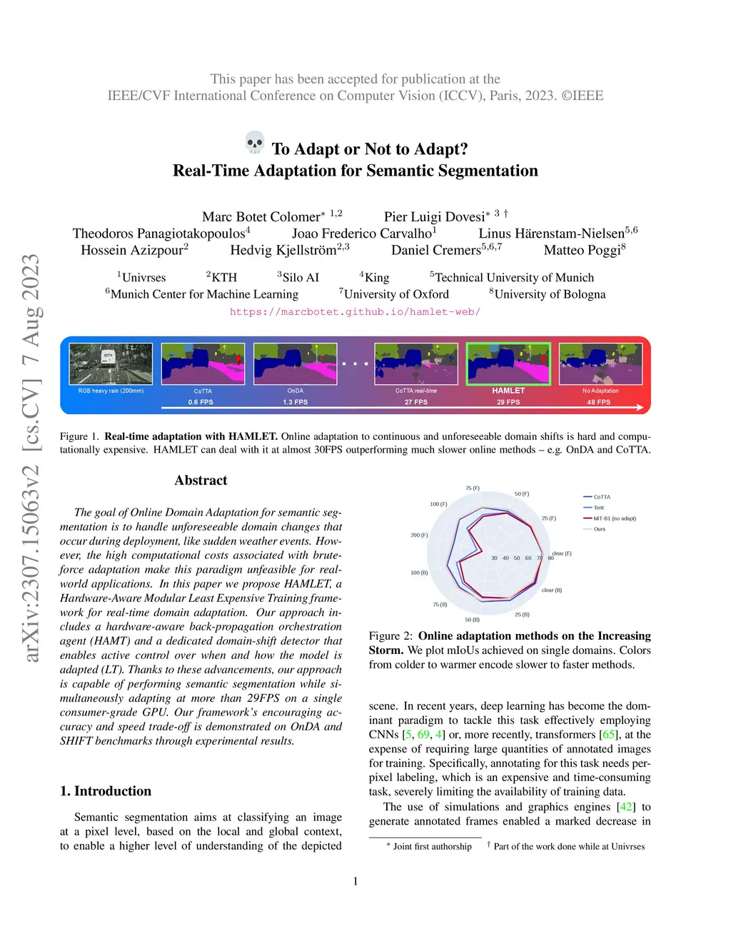 The goal of Online Domain Adaptation for semantic segmentation is to handle unforeseeable domain changes that occur during deployment, like sudden weather events. However, the high computational costs associated with brute-force adaptation make this paradigm unfeasible for real-world applications. In this paper we propose HAMLET, a Hardware-Aware Modular Least Expensive Training framework for real-time domain adaptation. Our approach includes a hardware-aware back-propagation orchestration agent (HAMT) and a dedicated domain-shift detector that enables active control over when and how the model is adapted (LT). Thanks to these advancements, our approach is capable of performing semantic segmentation while simultaneously adapting at more than 29FPS on a single consumer-grade GPU. Our framework's encouraging accuracy and speed trade-off is demonstrated on OnDA and SHIFT benchmarks through experimental results.