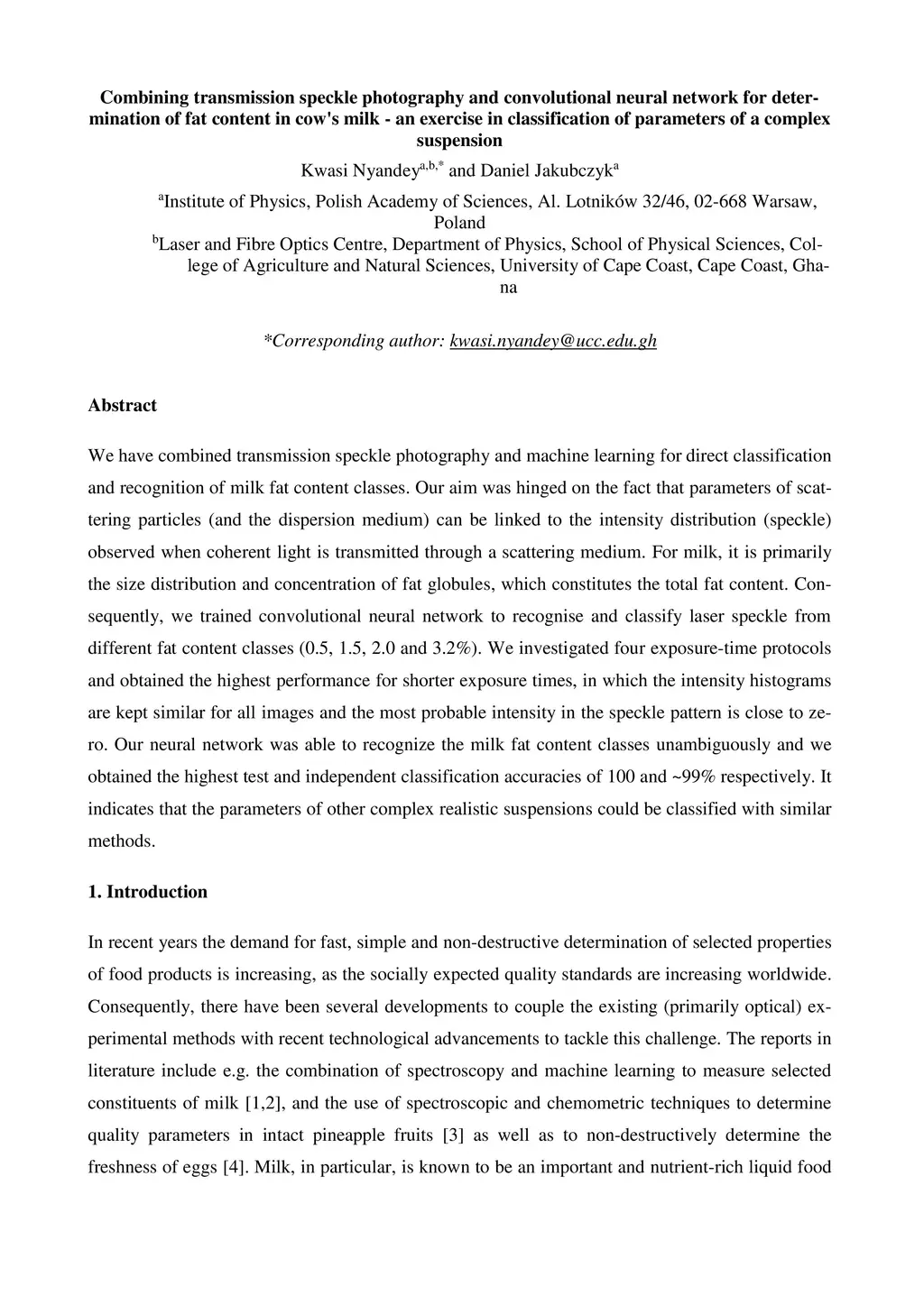 We have combined transmission speckle photography and machine learning for direct classification and recognition of milk fat content classes. Our aim was hinged on the fact that parameters of scattering particles (and the dispersion medium) can be linked to the intensity distribution (speckle) observed when coherent light is transmitted through a scattering medium. For milk, it is primarily the size distribution and concentration of fat globules, which constitutes the total fat content. Consequently, we trained convolutional neural network to recognise and classify laser speckle from different fat content classes (0.5, 1.5, 2.0 and 3.2%). We investigated four exposure-time protocols and obtained the highest performance for shorter exposure times, in which the intensity histograms are kept similar for all images and the most probable intensity in the speckle pattern is close to zero. Our neural network was able to recognize the milk fat content classes unambiguously and we obtained the highest test and independent classification accuracies of 100 and ~99% respectively. It indicates that the parameters of other complex realistic suspensions could be classified with similar methods.