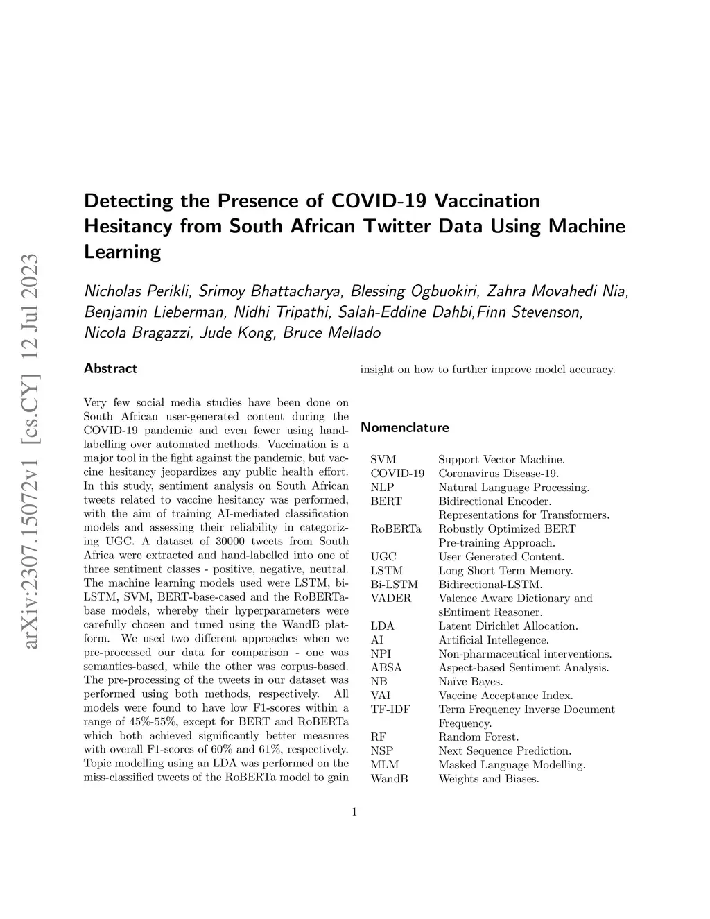 Very few social media studies have been done on South African user-generated content during the COVID-19 pandemic and even fewer using hand-labelling over automated methods. Vaccination is a major tool in the fight against the pandemic, but vaccine hesitancy jeopardizes any public health effort. In this study, sentiment analysis on South African tweets related to vaccine hesitancy was performed, with the aim of training AI-mediated classification models and assessing their reliability in categorizing UGC. A dataset of 30000 tweets from South Africa were extracted and hand-labelled into one of three sentiment classes: positive, negative, neutral. The machine learning models used were LSTM, bi-LSTM, SVM, BERT-base-cased and the RoBERTa-base models, whereby their hyperparameters were carefully chosen and tuned using the WandB platform. We used two different approaches when we pre-processed our data for comparison: one was semantics-based, while the other was corpus-based. The pre-processing of the tweets in our dataset was performed using both methods, respectively. All models were found to have low F1-scores within a range of 45-55, except for BERT and RoBERTa which both achieved significantly better measures with overall F1-scores of 60 and 61, respectively. Topic modelling using an LDA was performed on the miss-classified tweets of the RoBERTa model to gain insight on how to further improve model accuracy.