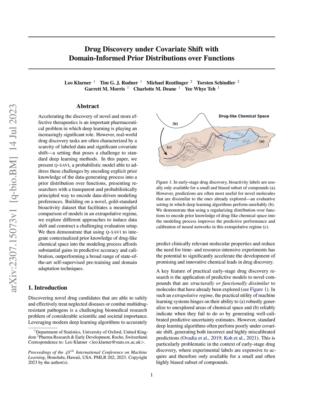 Accelerating the discovery of novel and more effective therapeutics is an important pharmaceutical problem in which deep learning is playing an increasingly significant role. However, real-world drug discovery tasks are often characterized by a scarcity of labeled data and significant covariate shifta setting that poses a challenge to standard deep learning methods. In this paper, we present Q-SAVI, a probabilistic model able to address these challenges by encoding explicit prior knowledge of the data-generating process into a prior distribution over functions, presenting researchers with a transparent and probabilistically principled way to encode data-driven modeling preferences. Building on a novel, gold-standard bioactivity dataset that facilitates a meaningful comparison of models in an extrapolative regime, we explore different approaches to induce data shift and construct a challenging evaluation setup. We then demonstrate that using Q-SAVI to integrate contextualized prior knowledge of drug-like chemical space into the modeling process affords substantial gains in predictive accuracy and calibration, outperforming a broad range of state-of-the-art self-supervised pre-training and domain adaptation techniques.