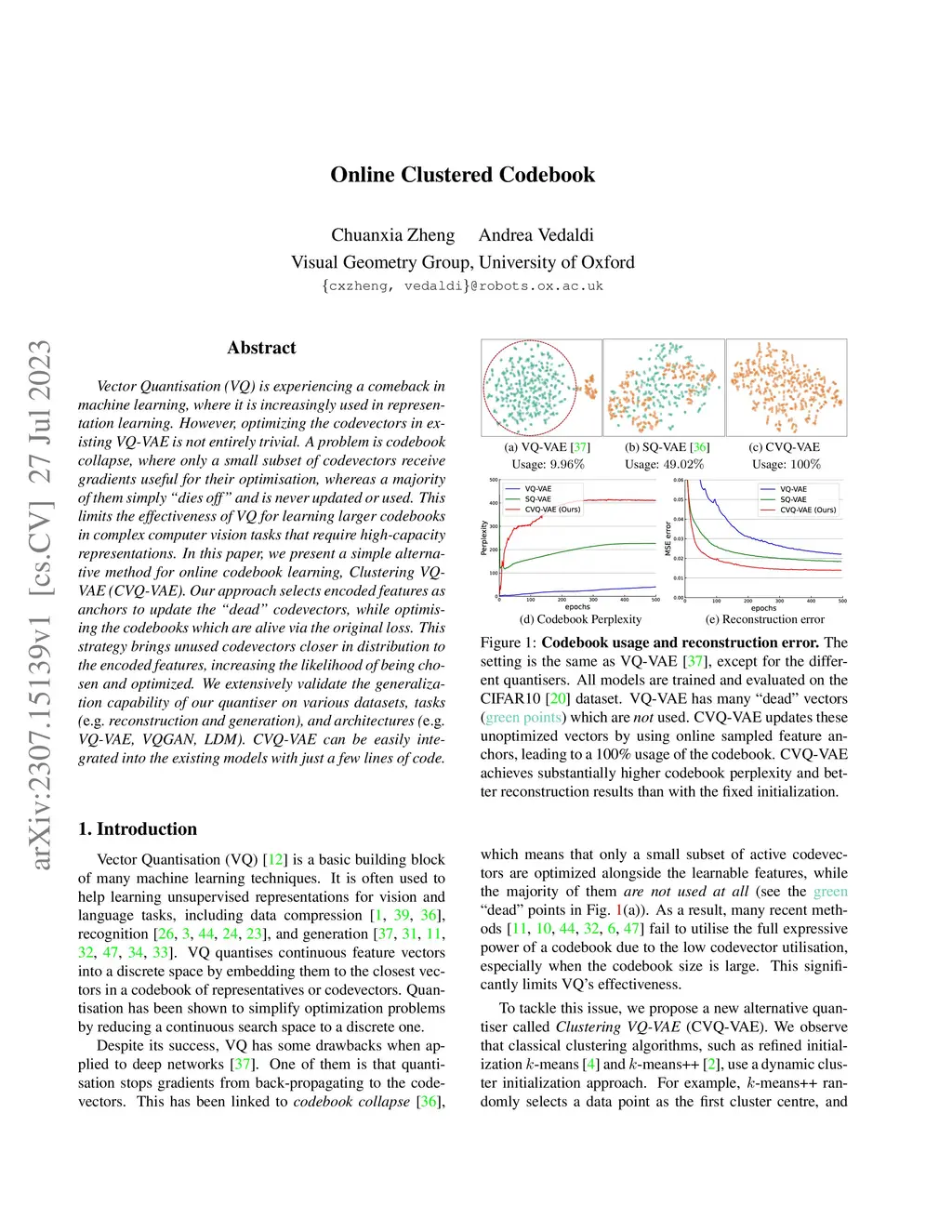 Vector Quantisation (VQ) is experiencing a comeback in machine learning, where it is increasingly used in representation learning. However, optimizing the codevectors in existing VQ-VAE is not entirely trivial. A problem is codebook collapse, where only a small subset of codevectors receive gradients useful for their optimisation, whereas a majority of them simply ``dies off'' and is never updated or used. This limits the effectiveness of VQ for learning larger codebooks in complex computer vision tasks that require high-capacity representations. In this paper, we present a simple alternative method for online codebook learning, Clustering VQ-VAE (CVQ-VAE). Our approach selects encoded features as anchors to update the ``dead'' codevectors, while optimising the codebooks which are alive via the original loss. This strategy brings unused codevectors closer in distribution to the encoded features, increasing the likelihood of being chosen and optimized. We extensively validate the generalization capability of our quantiser on various datasets, tasks (e.g. reconstruction and generation), and architectures (e.g. VQ-VAE, VQGAN, LDM). Our CVQ-VAE can be easily integrated into the existing models with just a few lines of code.