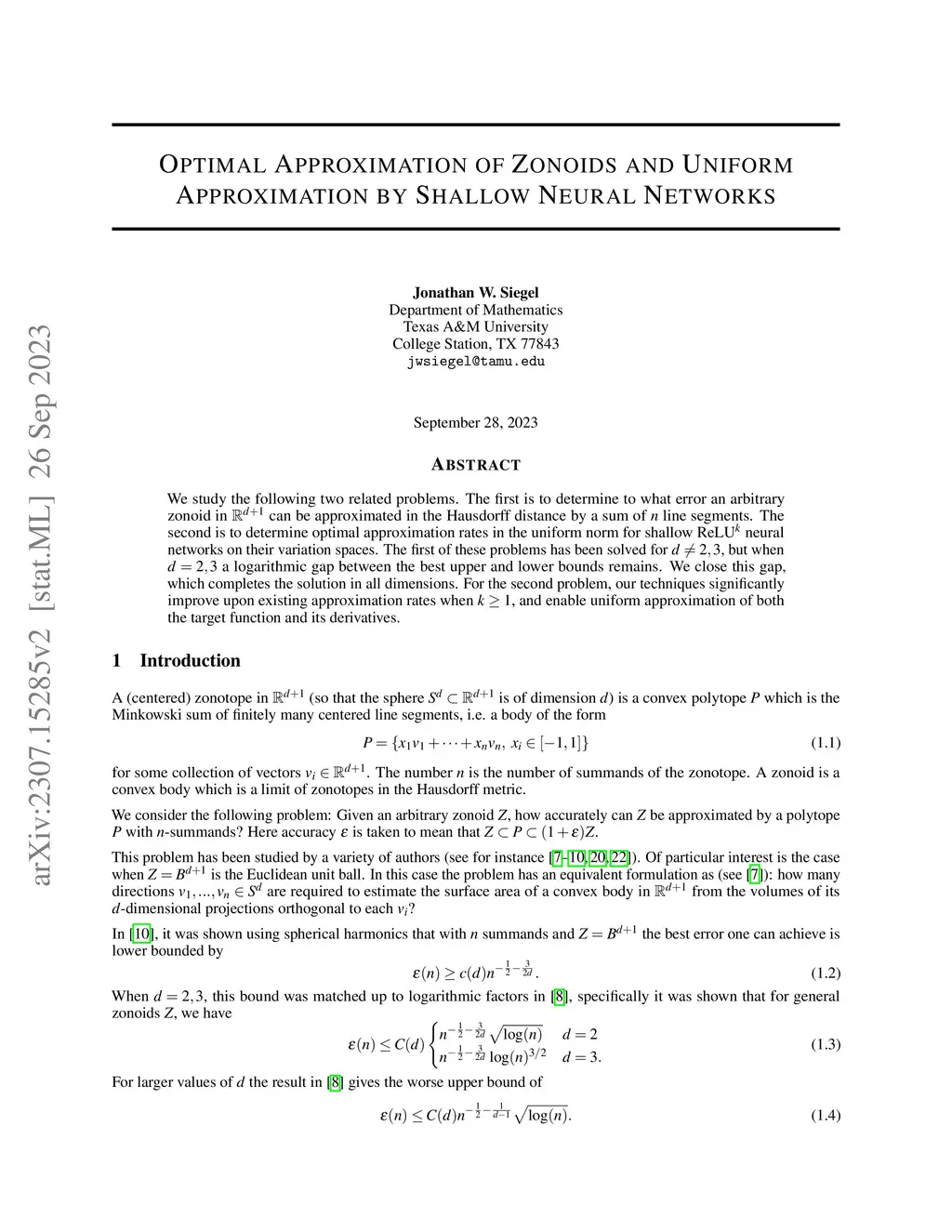 We study the following two related problems. The first is to determine to what error an arbitrary zonoid in can be approximated in the Hausdorff distance by a sum of line segments. The second is to determine optimal approximation rates in the uniform norm for shallow ReLU neural networks on their variation spaces. The first of these problems has been solved for , but when a logarithmic gap between the best upper and lower bounds remains. We close this gap, which completes the solution in all dimensions. For the second problem, our techniques significantly improve upon existing approximation rates when , and enable uniform approximation of both the target function and its derivatives.