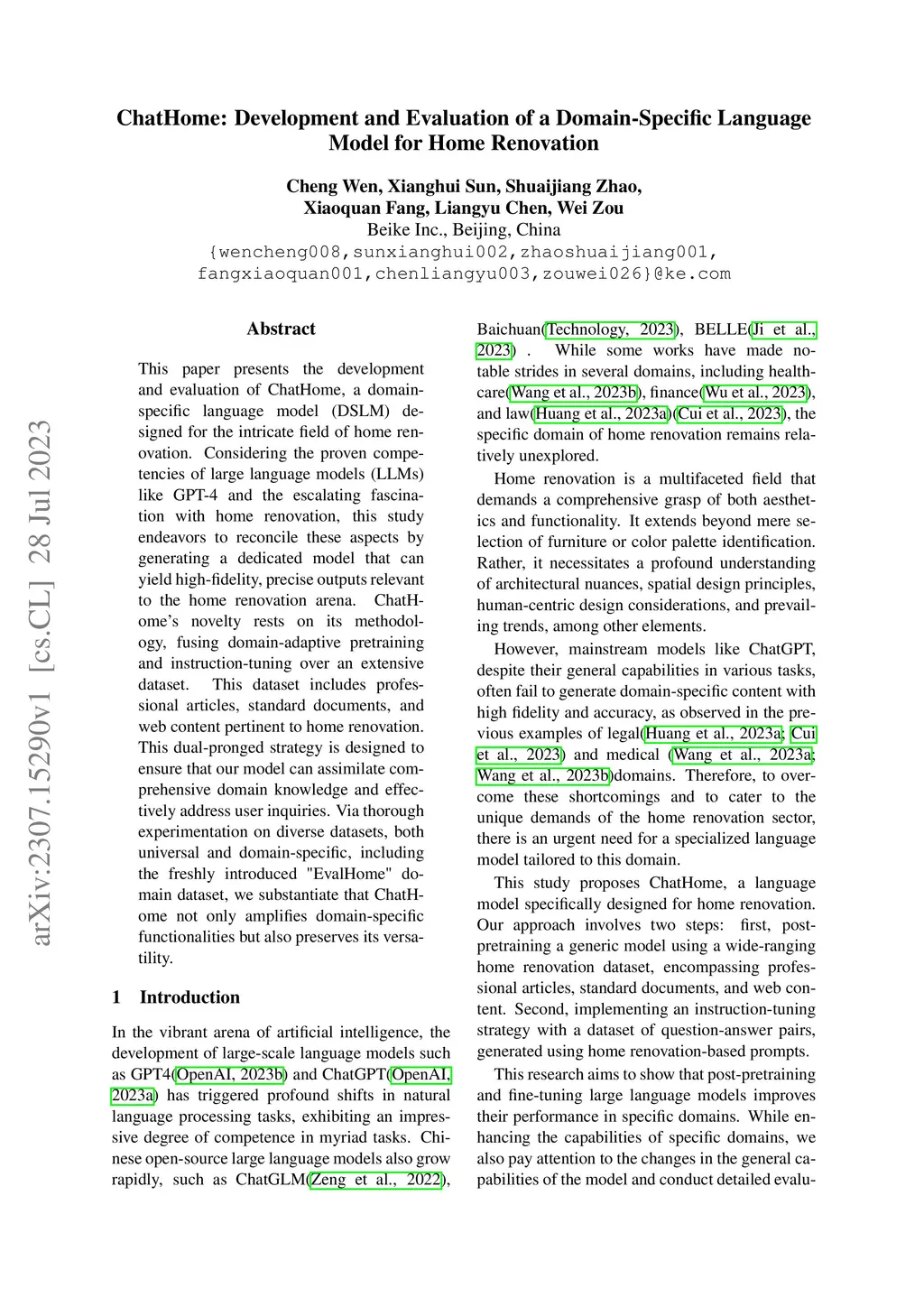 This paper presents the development and evaluation of ChatHome, a domain-specific language model (DSLM) designed for the intricate field of home renovation. Considering the proven competencies of large language models (LLMs) like GPT-4 and the escalating fascination with home renovation, this study endeavors to reconcile these aspects by generating a dedicated model that can yield high-fidelity, precise outputs relevant to the home renovation arena. ChatHome's novelty rests on its methodology, fusing domain-adaptive pretraining and instruction-tuning over an extensive dataset. This dataset includes professional articles, standard documents, and web content pertinent to home renovation. This dual-pronged strategy is designed to ensure that our model can assimilate comprehensive domain knowledge and effectively address user inquiries. Via thorough experimentation on diverse datasets, both universal and domain-specific, including the freshly introduced "EvalHome" domain dataset, we substantiate that ChatHome not only amplifies domain-specific functionalities but also preserves its versatility.