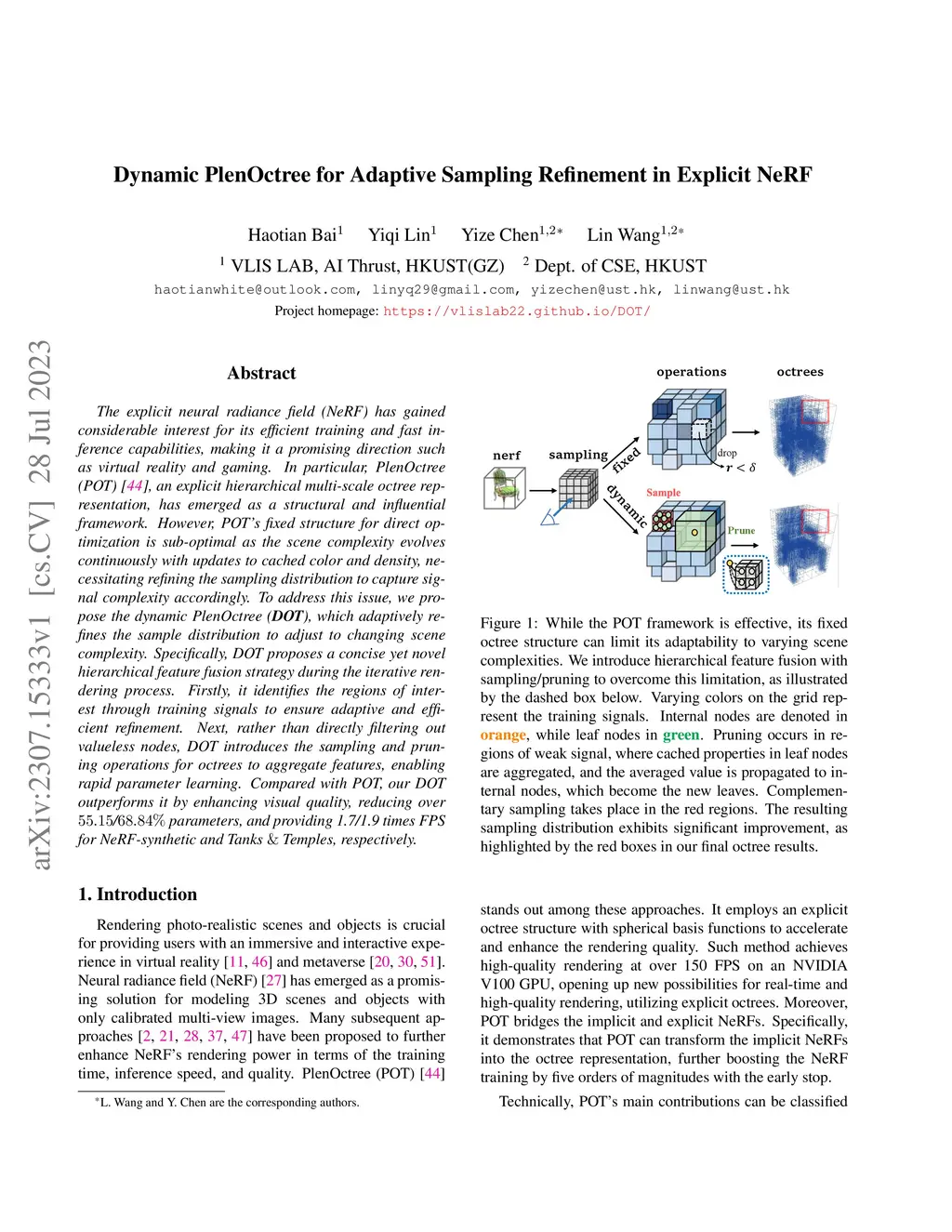 The explicit neural radiance field (NeRF) has gained considerable interest for its efficient training and fast inference capabilities, making it a promising direction such as virtual reality and gaming. In particular, PlenOctree (POT)[1], an explicit hierarchical multi-scale octree representation, has emerged as a structural and influential framework. However, POT's fixed structure for direct optimization is sub-optimal as the scene complexity evolves continuously with updates to cached color and density, necessitating refining the sampling distribution to capture signal complexity accordingly. To address this issue, we propose the dynamic PlenOctree DOT, which adaptively refines the sample distribution to adjust to changing scene complexity. Specifically, DOT proposes a concise yet novel hierarchical feature fusion strategy during the iterative rendering process. Firstly, it identifies the regions of interest through training signals to ensure adaptive and efficient refinement. Next, rather than directly filtering out valueless nodes, DOT introduces the sampling and pruning operations for octrees to aggregate features, enabling rapid parameter learning. Compared with POT, our DOT outperforms it by enhancing visual quality, reducing over / parameters, and providing 1.7/1.9 times FPS for NeRF-synthetic and Tanks Temples, respectively. Project homepage:https://vlislab22.github.io/DOT. [1] Yu, Alex, et al. "Plenoctrees for real-time rendering of neural radiance fields." Proceedings of the IEEE/CVF International Conference on Computer Vision. 2021.