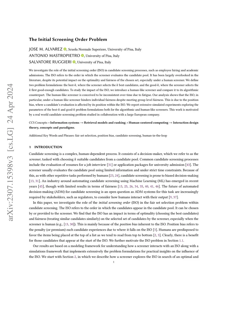 We investigate the role of the initial screening order (ISO) in candidate screening. The ISO refers to the order in which the screener searches the candidate pool when selecting candidates. Today, it is common for the ISO to be the product of an information access system, such as an online platform or a database query. The ISO has been largely overlooked in the literature, despite its impact on the optimality and fairness of the selected candidates, especially under a human screener. We define two problem formulations describing the search behavior of the screener given an ISO: the best-, where it selects the top candidates; and the good-, where it selects the first good-enough candidates. To study the impact of the ISO, we introduce a human-like screener and compare it to its algorithmic counterpart, where the human-like screener is conceived to be inconsistent over time. Our analysis, in particular, shows that the ISO, under a human-like screener solving for the good- problem, hinders individual fairness despite meeting group fairness, and hampers the optimality of the selected candidates. This is due to position bias, where a candidate's evaluation is affected by its position within the ISO. We report extensive simulated experiments exploring the parameters of the best- and good- problems for both screeners. Our simulation framework is flexible enough to account for multiple candidate screening tasks, being an alternative to running real-world procedures.
