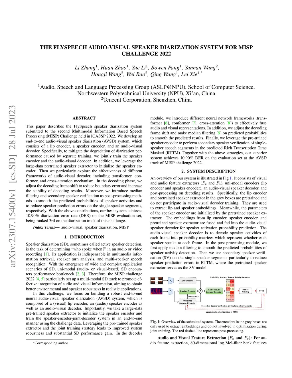 This paper describes the FlySpeech speaker diarization system submitted to the second \textbf{M}ultimodal \textbf{I}nformation Based \textbf{S}peech \textbf{P}rocessing~(\textbf{MISP}) Challenge held in ICASSP 2022. We develop an end-to-end audio-visual speaker diarization~(AVSD) system, which consists of a lip encoder, a speaker encoder, and an audio-visual decoder. Specifically, to mitigate the degradation of diarization performance caused by separate training, we jointly train the speaker encoder and the audio-visual decoder. In addition, we leverage the large-data pretrained speaker extractor to initialize the speaker encoder.