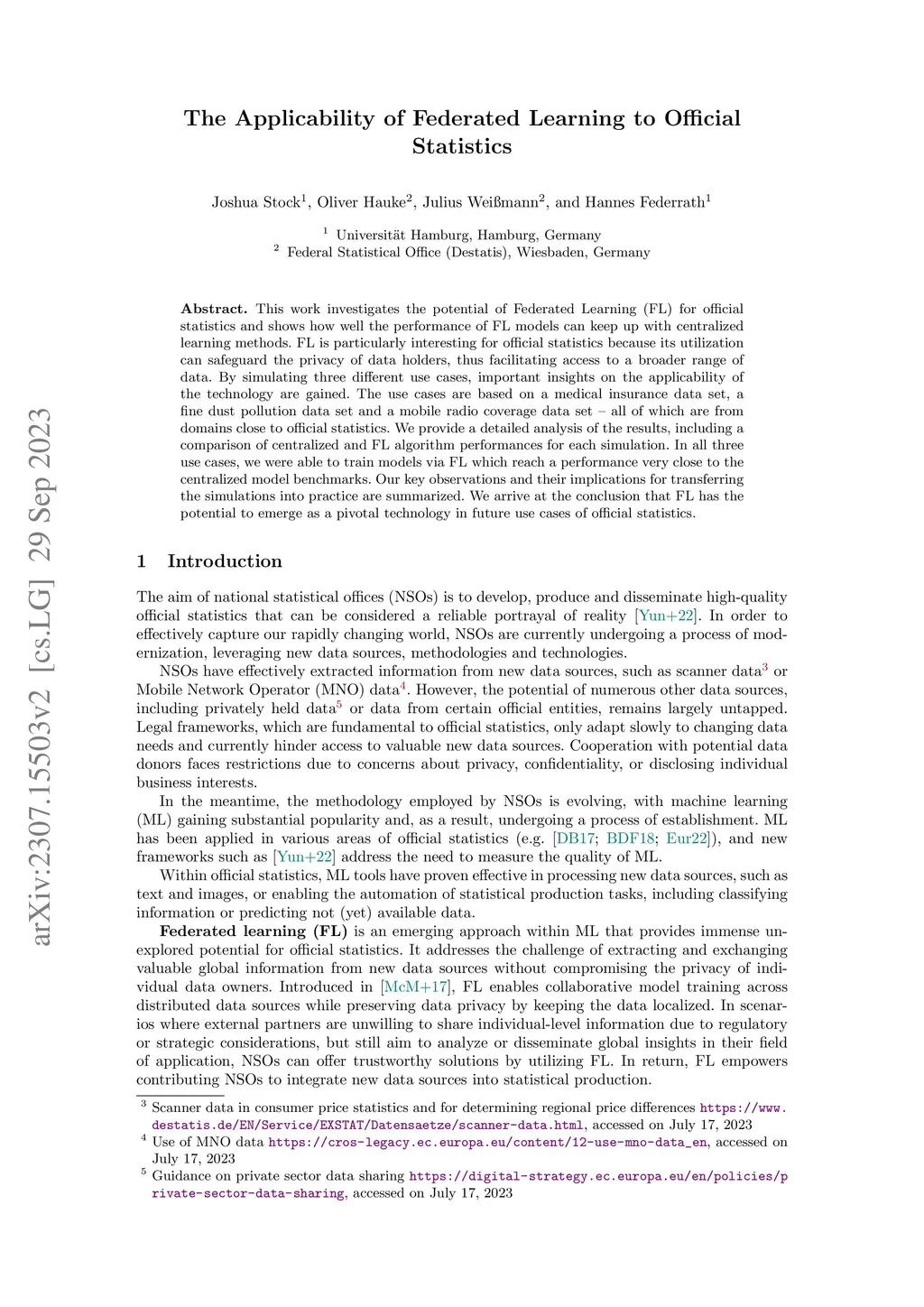 This work investigates the potential of Federated Learning (FL) for official statistics and shows how well the performance of FL models can keep up with centralized learning methods.F L is particularly interesting for official statistics because its utilization can safeguard the privacy of data holders, thus facilitating access to a broader range of data. By simulating three different use cases, important insights on the applicability of the technology are gained. The use cases are based on a medical insurance data set, a fine dust pollution data set and a mobile radio coverage data set - all of which are from domains close to official statistics. We provide a detailed analysis of the results, including a comparison of centralized and FL algorithm performances for each simulation. In all three use cases, we were able to train models via FL which reach a performance very close to the centralized model benchmarks. Our key observations and their implications for transferring the simulations into practice are summarized. We arrive at the conclusion that FL has the potential to emerge as a pivotal technology in future use cases of official statistics.