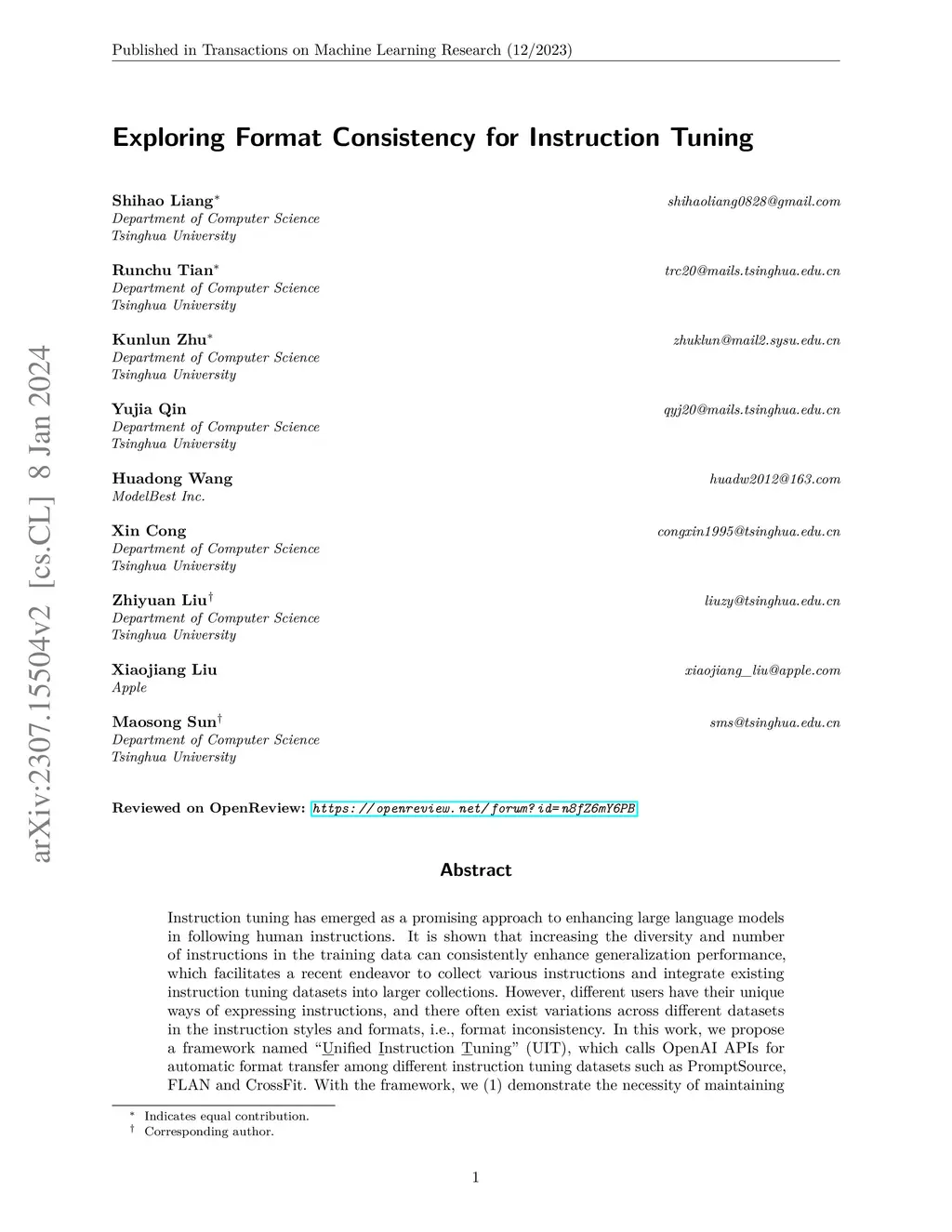 Instruction tuning has emerged as a promising approach to enhancing large language models in following human instructions. It is shown that increasing the diversity and number of instructions in the training data can consistently enhance generalization performance, which facilitates a recent endeavor to collect various instructions and integrate existing instruction tuning datasets into larger collections. However, different users have their unique ways of expressing instructions, and there often exist variations across different datasets in the instruction styles and formats, i.e., format inconsistency. In this work, we propose a framework named Unified Instruction Tuning (UIT), which calls OpenAI APIs for automatic format transfer among different instruction tuning datasets such as PromptSource, FLAN and CrossFit. With the framework, we (1) demonstrate the necessity of maintaining format consistency in instruction tuning; (2) improve the generalization performance on unseen instructions on T5-LM-xl; (3) provide a novel perplexity-based denoising method to reduce the noise of automatic format transfer to make the UIT framework more practical and a smaller offline model based on GPT-J that achieves comparable format transfer capability to OpenAI APIs to reduce costs in practice. Further analysis regarding variations of targeted formats and other effects is intended.