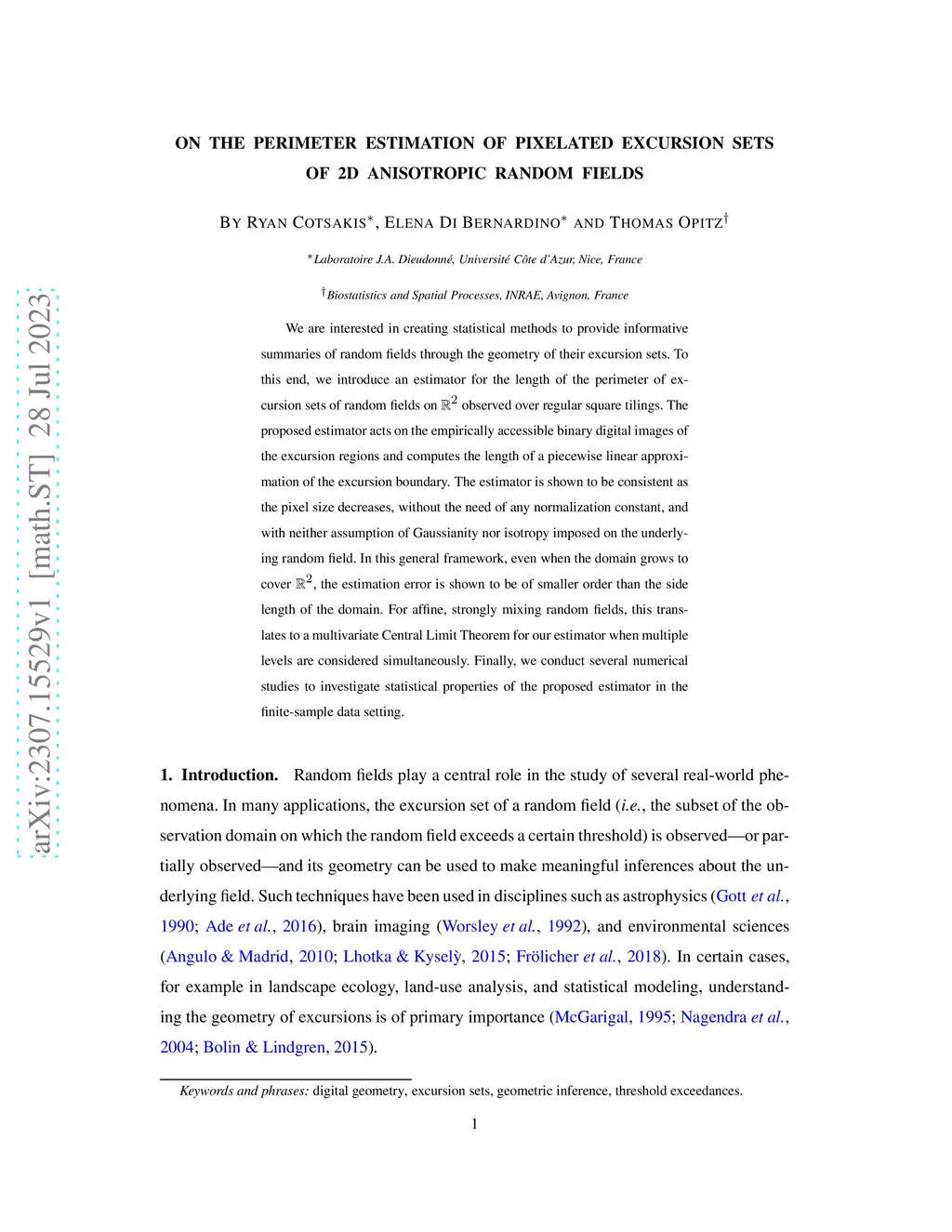 We are interested in creating statistical methods to provide informative summaries of random fields through the geometry of their excursion sets. To this end, we introduce an estimator for the length of the perimeter of excursion sets of random fields on observed over regular square tilings. The proposed estimator acts on the empirically accessible binary digital images of the excursion regions and computes the length of a piecewise linear approximation of the excursion boundary. The estimator is shown to be consistent as the pixel size decreases, without the need of any normalization constant, and with neither assumption of Gaussianity nor isotropy imposed on the underlying random field. In this general framework, even when the domain grows to cover , the estimation error is shown to be of smaller order than the side length of the domain. For affine, strongly mixing random fields, this translates to a multivariate Central Limit Theorem for our estimator when multiple levels are considered simultaneously. Finally, we conduct several numerical studies to investigate statistical properties of the proposed estimator in the finite-sample data setting.