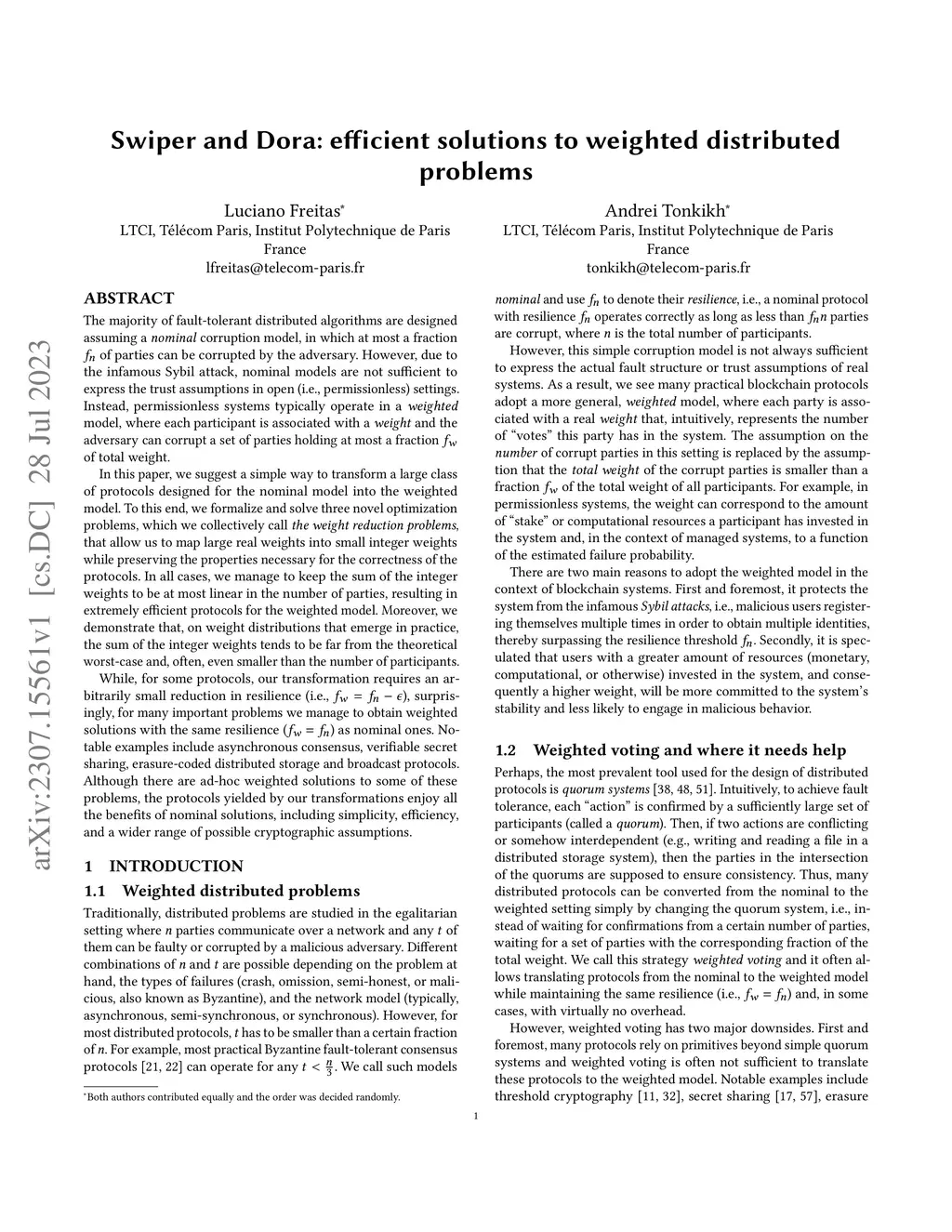 Swiper and Dora: efficient solutions to weighted distributed problems