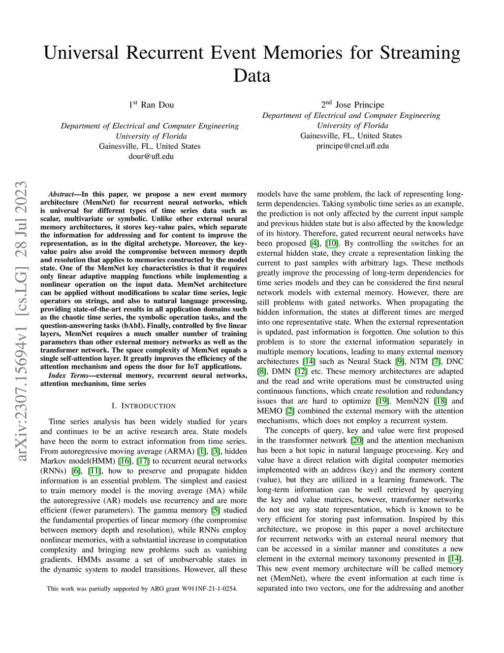In this paper, we propose a new event memory architecture (MemNet) for recurrent neural networks, which is universal for different types of time series data such as scalar, multivariate or symbolic. Unlike other external neural memory architectures, it stores key-value pairs, which separate the information for addressing and for content to improve the representation, as in the digital archetype. Moreover, the key-value pairs also avoid the compromise between memory depth and resolution that applies to memories constructed by the model state. One of the MemNet key characteristics is that it requires only linear adaptive mapping functions while implementing a nonlinear operation on the input data. MemNet architecture can be applied without modifications to scalar time series, logic operators on strings, and also to natural language processing, providing state-of-the-art results in all application domains such as the chaotic time series, the symbolic operation tasks, and the question-answering tasks (bAbI). Finally, controlled by five linear layers, MemNet requires a much smaller number of training parameters than other external memory networks as well as the transformer network. The space complexity of MemNet equals a single self-attention layer. It greatly improves the efficiency of the attention mechanism and opens the door for IoT applications.