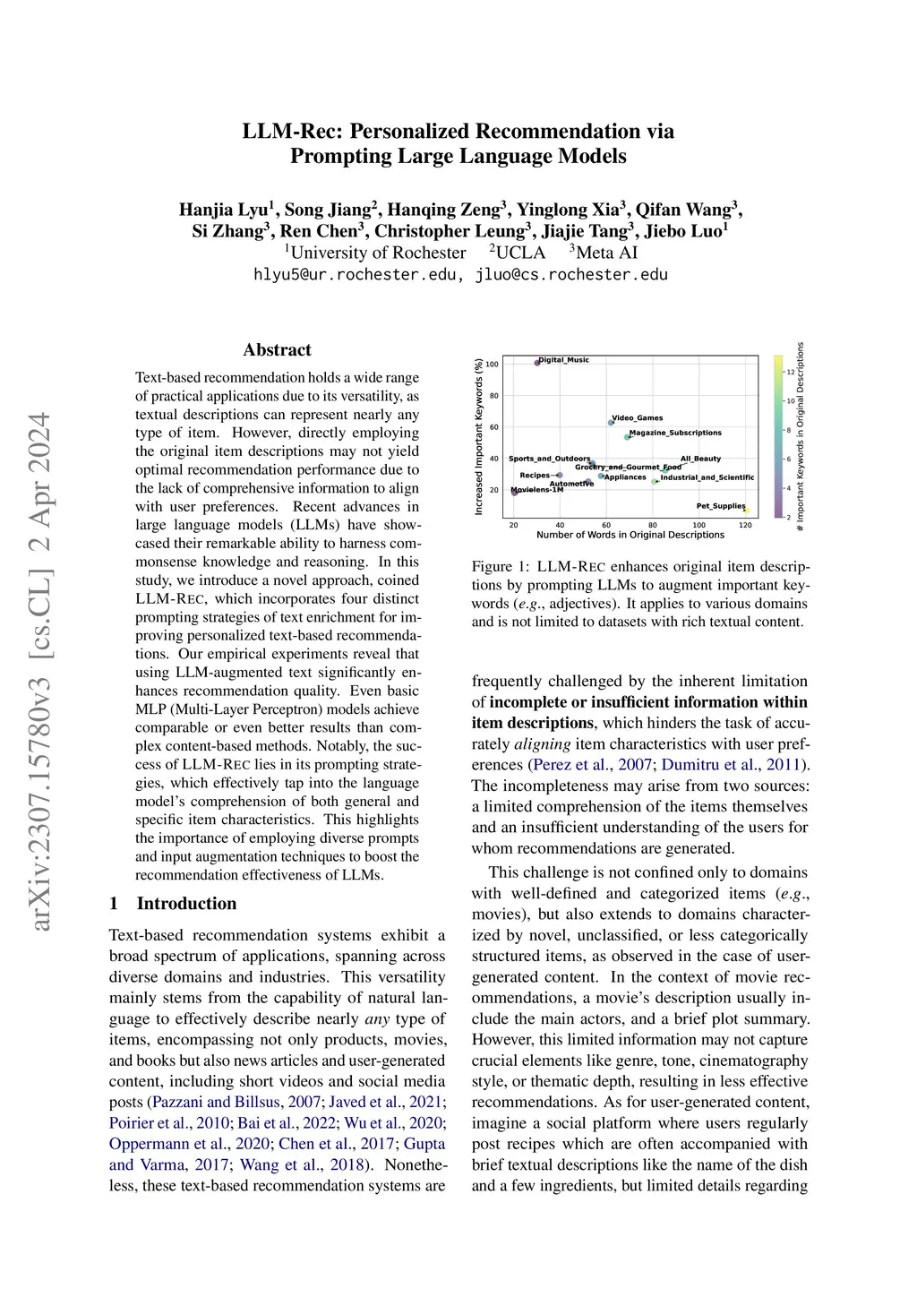 LLM-Rec: Personalized Recommendation via Prompting Large Language Models