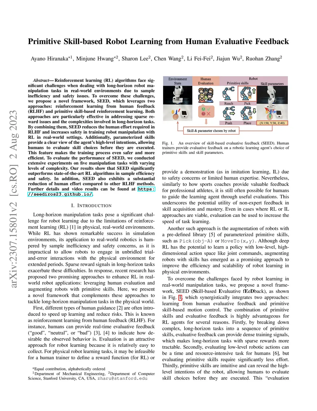 Reinforcement learning (RL) algorithms face significant challenges when dealing with long-horizon robot manipulation tasks in real-world environments due to sample inefficiency and safety issues. To overcome these challenges, we propose a novel framework, SEED, which leverages two approaches: reinforcement learning from human feedback (RLHF) and primitive skill-based reinforcement learning. Both approaches are particularly effective in addressing sparse reward issues and the complexities involved in long-horizon tasks. By combining them, SEED reduces the human effort required in RLHF and increases safety in training robot manipulation with RL in real-world settings. Additionally, parameterized skills provide a clear view of the agent's high-level intentions, allowing humans to evaluate skill choices before they are executed. This feature makes the training process even safer and more efficient. To evaluate the performance of SEED, we conducted extensive experiments on five manipulation tasks with varying levels of complexity. Our results show that SEED significantly outperforms state-of-the-art RL algorithms in sample efficiency and safety. In addition, SEED also exhibits a substantial reduction of human effort compared to other RLHF methods. Further details and video results can be found at https://seediros23.github.io/.