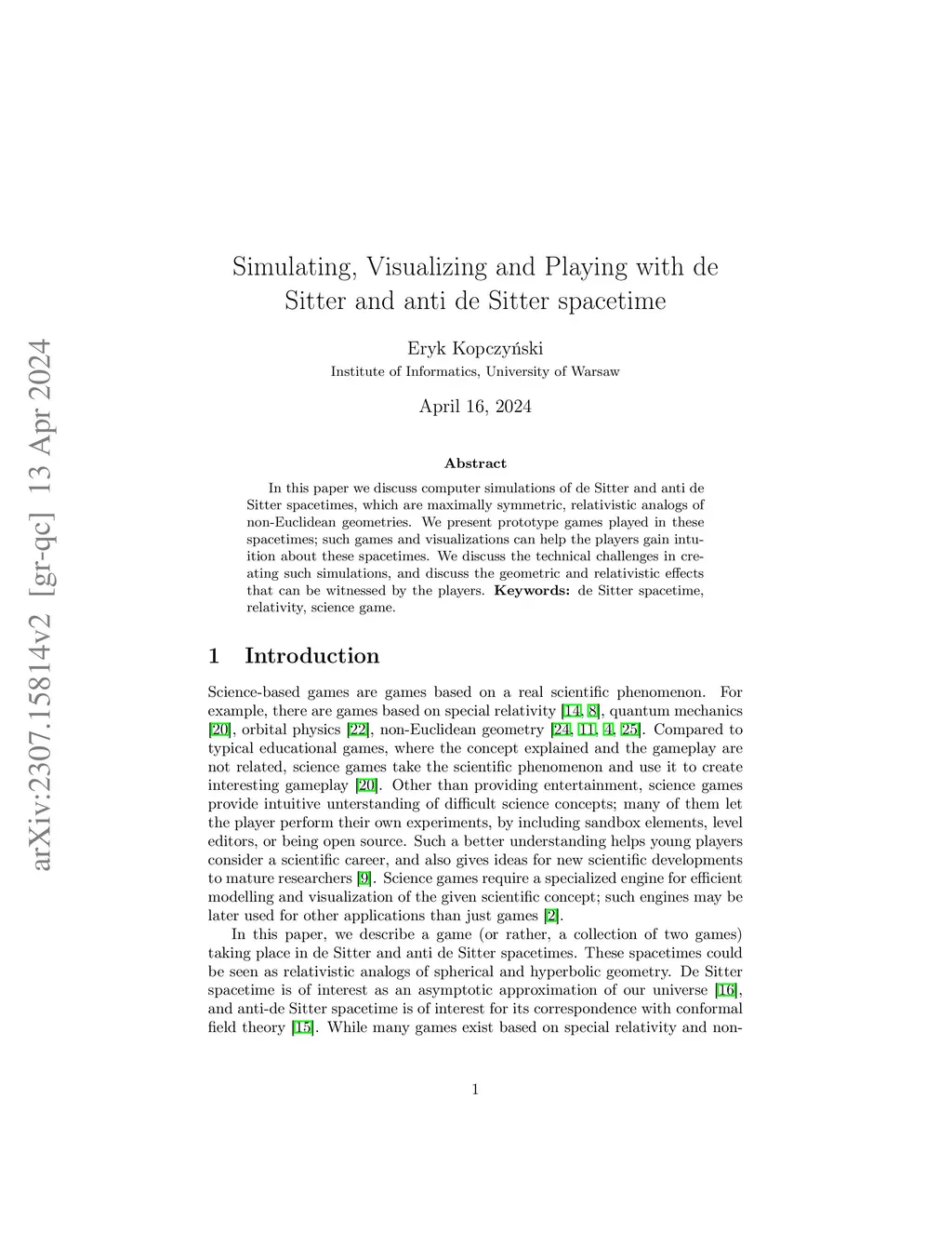 In this paper we discuss computer simulations of de Sitter and anti de Sitter spacetimes, which are maximally symmetric, relativistic analogs of non-Euclidean geometries. We present prototype games played in these spacetimes; such games and visualizations can help the players gain intuition about these spacetimes. We discuss the technical challenges in creating such simulations, and discuss the geometric and relativistic effects that can be witnessed by the players.