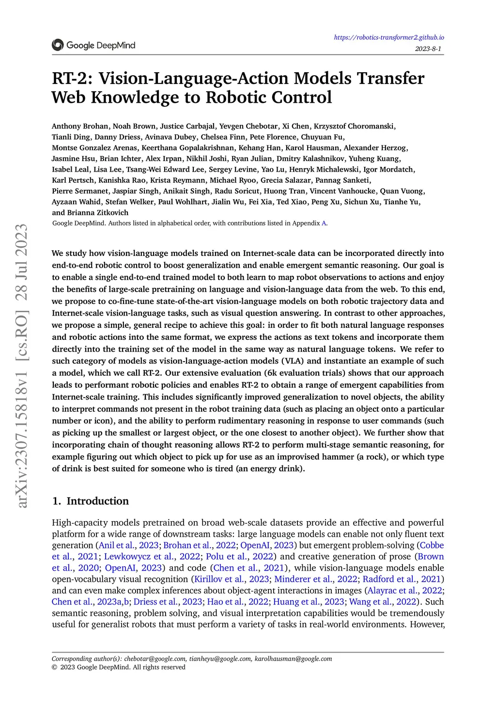 We study how vision-language models trained on Internet-scale data can be incorporated directly into end-to-end robotic control to boost generalization and enable emergent semantic reasoning. Our goal is to enable a single end-to-end trained model to both learn to map robot observations to actions and enjoy the benefits of large-scale pretraining on language and vision-language data from the web. To this end, we propose to co-fine-tune state-of-the-art vision-language models on both robotic trajectory data and Internet-scale vision-language tasks, such as visual question answering. In contrast to other approaches, we propose a simple, general recipe to achieve this goal: in order to fit both natural language responses and robotic actions into the same format, we express the actions as text tokens and incorporate them directly into the training set of the model in the same way as natural language tokens. We refer to such category of models as vision-language-action models (VLA) and instantiate an example of such a model, which we call RT-2. Our extensive evaluation (6k evaluation trials) shows that our approach leads to performant robotic policies and enables RT-2 to obtain a range of emergent capabilities from Internet-scale training. This includes significantly improved generalization to novel objects, the ability to interpret commands not present in the robot training data (such as placing an object onto a particular number or icon), and the ability to perform rudimentary reasoning in response to user commands (such as picking up the smallest or largest object, or the one closest to another object). We further show that incorporating chain of thought reasoning allows RT-2 to perform multi-stage semantic reasoning, for example figuring out which object to pick up for use as an improvised hammer (a rock), or which type of drink is best suited for someone who is tired (an energy drink).
