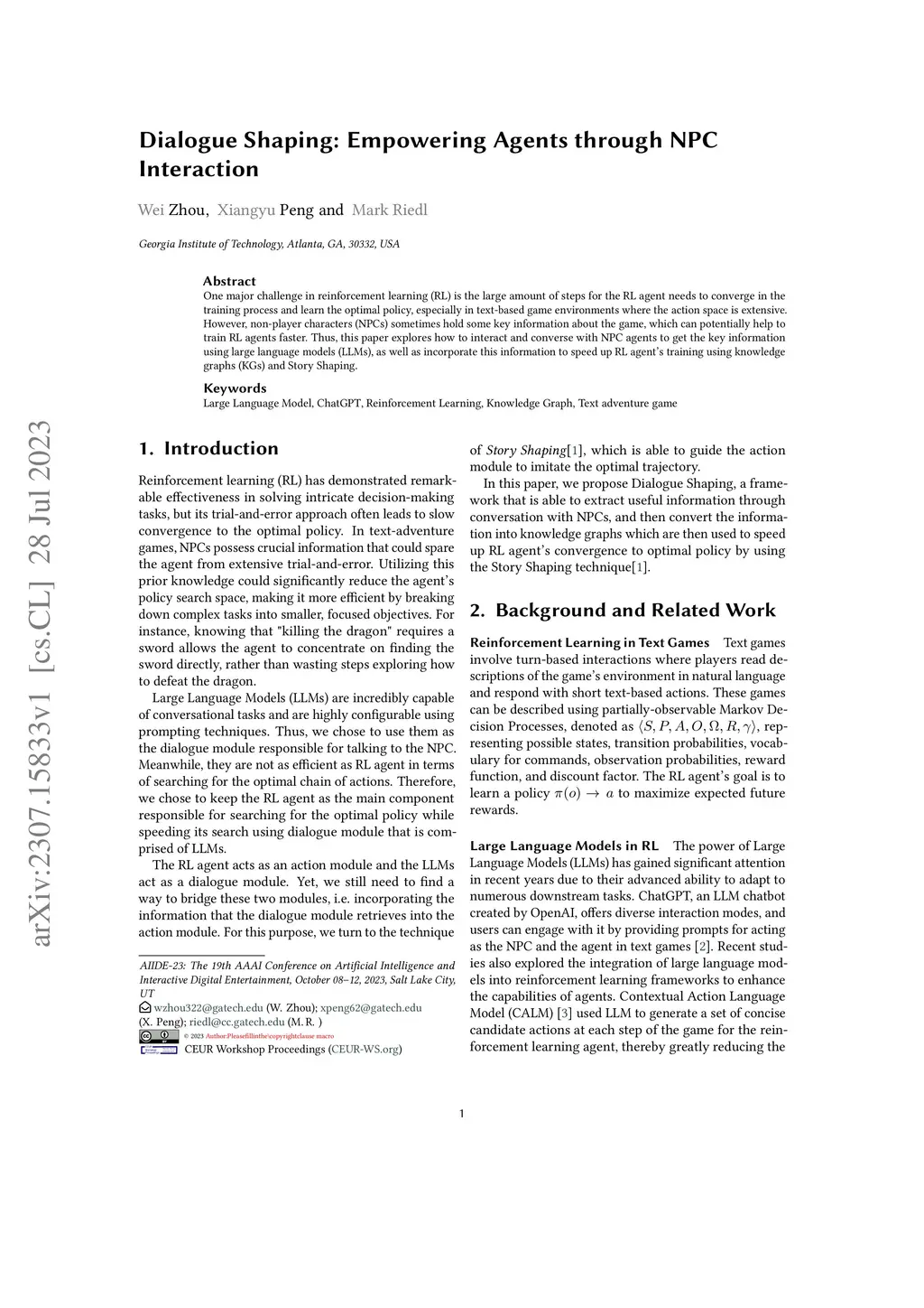 One major challenge in reinforcement learning (RL) is the large amount of steps for the RL agent needs to converge in the training process and learn the optimal policy, especially in text-based game environments where the action space is extensive. However, non-player characters (NPCs) sometimes hold some key information about the game, which can potentially help to train RL agents faster. Thus, this paper explores how to interact and converse with NPC agents to get the key information using large language models (LLMs), as well as incorporate this information to speed up RL agent's training using knowledge graphs (KGs) and Story Shaping.