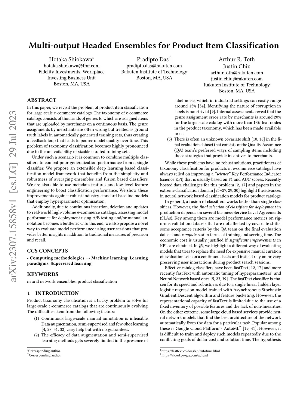 In this paper, we revisit the problem of product item classification for large-scale e-commerce catalogs. The taxonomy of e-commerce catalogs consists of thousands of genres to which are assigned items that are uploaded by merchants on a continuous basis. The genre assignments by merchants are often wrong but treated as ground truth labels in automatically generated training sets, thus creating a feedback loop that leads to poorer model quality over time. This problem of taxonomy classification becomes highly pronounced due to the unavailability of sizable curated training sets. Under such a scenario it is common to combine multiple classifiers to combat poor generalization performance from a single classifier. We propose an extensible deep learning based classification model framework that benefits from the simplicity and robustness of averaging ensembles and fusion based classifiers. We are also able to use metadata features and low-level feature engineering to boost classification performance. We show these improvements against robust industry standard baseline models that employ hyperparameter optimization. Additionally, due to continuous insertion, deletion and updates to real-world high-volume e-commerce catalogs, assessing model performance for deployment using A/B testing and/or manual annotation becomes a bottleneck. To this end, we also propose a novel way to evaluate model performance using user sessions that provides better insights in addition to traditional measures of precision and recall.