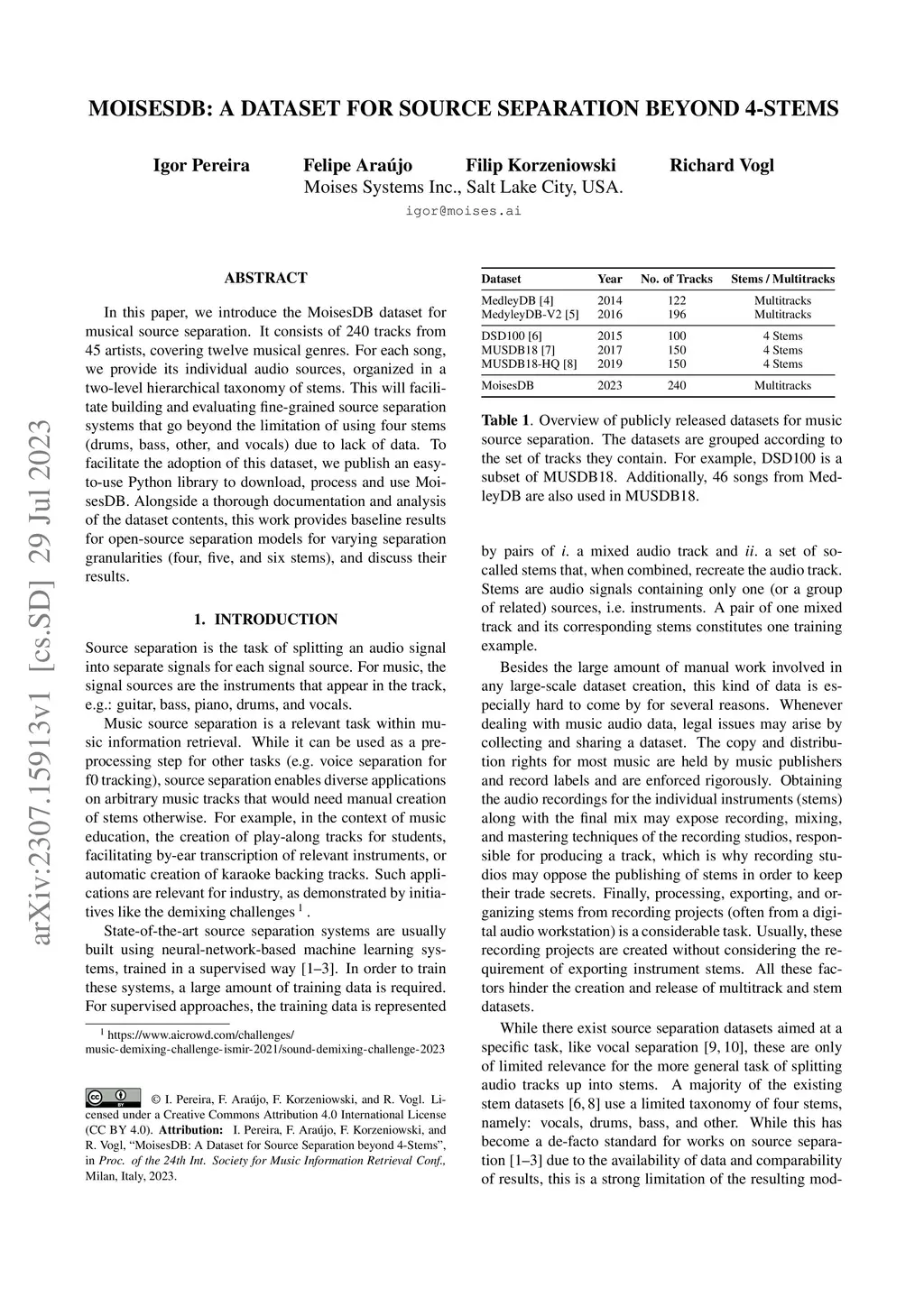 In this paper, we introduce the MoisesDB dataset for musical source separation. It consists of 240 tracks from 45 artists, covering twelve musical genres. For each song, we provide its individual audio sources, organized in a two-level hierarchical taxonomy of stems. This will facilitate building and evaluating fine-grained source separation systems that go beyond the limitation of using four stems (drums, bass, other, and vocals) due to lack of data. To facilitate the adoption of this dataset, we publish an easy-to-use Python library to download, process and use MoisesDB. Alongside a thorough documentation and analysis of the dataset contents, this work provides baseline results for open-source separation models for varying separation granularities (four, five, and six stems), and discuss their results.