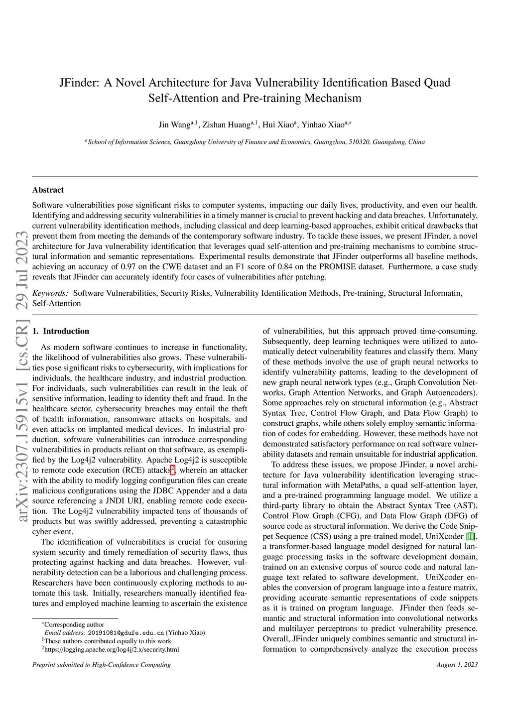 Software vulnerabilities pose significant risks to computer systems, impacting our daily lives, productivity, and even our health. Identifying and addressing security vulnerabilities in a timely manner is crucial to prevent hacking and data breaches. Unfortunately, current vulnerability identification methods, including classical and deep learning-based approaches, exhibit critical drawbacks that prevent them from meeting the demands of the contemporary software industry. To tackle these issues, we present JFinder, a novel architecture for Java vulnerability identification that leverages quad self-attention and pre-training mechanisms to combine structural information and semantic representations. Experimental results demonstrate that JFinder outperforms all baseline methods, achieving an accuracy of 0.97 on the CWE dataset and an F1 score of 0.84 on the PROMISE dataset. Furthermore, a case study reveals that JFinder can accurately identify four cases of vulnerabilities after patching.