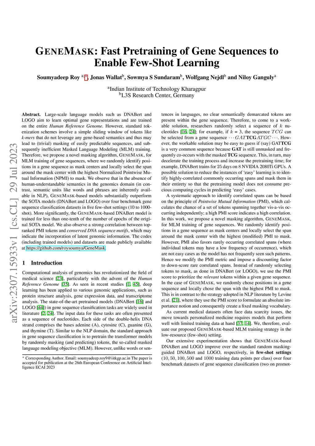 Large-scale language models such as DNABert and LOGO aim to learn optimal gene representations and are trained on the entire Human Reference Genome. However, standard tokenization schemes involve a simple sliding window of tokens like k-mers that do not leverage any gene-based semantics and thus may lead to (trivial) masking of easily predictable sequences and subsequently inefficient Masked Language Modeling (MLM) training. Therefore, we propose a novel masking algorithm, GeneMask, for MLM training of gene sequences, where we randomly identify positions in a gene sequence as mask centers and locally select the span around the mask center with the highest Normalized Pointwise Mutual Information (NPMI) to mask. We observe that in the absence of human-understandable semantics in the genomics domain (in contrast, semantic units like words and phrases are inherently available in NLP), GeneMask-based models substantially outperform the SOTA models (DNABert and LOGO) over four benchmark gene sequence classification datasets in five few-shot settings (10 to 1000-shot). More significantly, the GeneMask-based DNABert model is trained for less than one-tenth of the number of epochs of the original SOTA model. We also observe a strong correlation between top-ranked PMI tokens and conserved DNA sequence motifs, which may indicate the incorporation of latent genomic information. The codes (including trained models) and datasets are made publicly available at https://github.com/roysoumya/GeneMask.