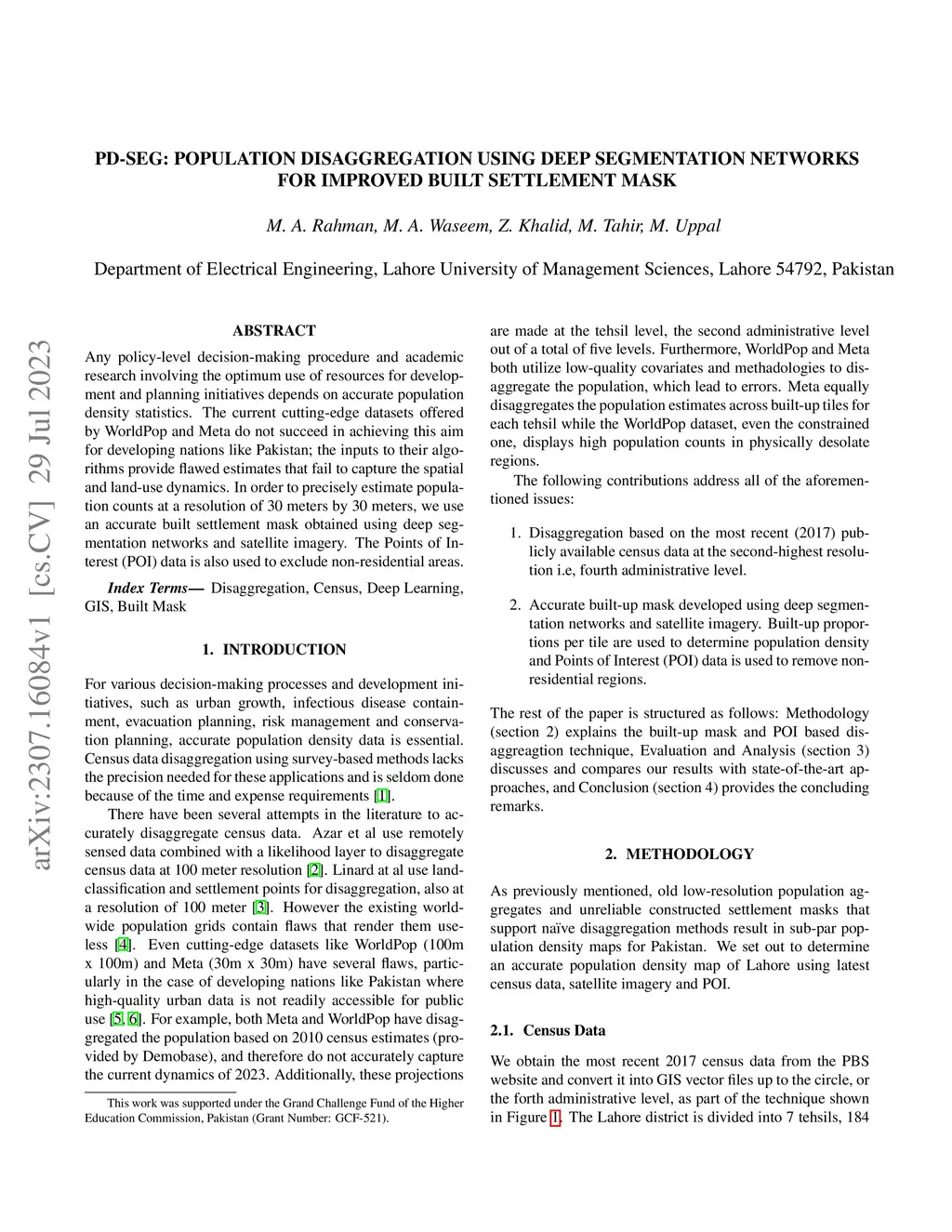 Any policy-level decision-making procedure and academic research involving the optimum use of resources for development and planning initiatives depends on accurate population density statistics. The current cutting-edge datasets offered by WorldPop and Meta do not succeed in achieving this aim for developing nations like Pakistan; the inputs to their algorithms provide flawed estimates that fail to capture the spatial and land-use dynamics. In order to precisely estimate population counts at a resolution of 30 meters by 30 meters, we use an accurate built settlement mask obtained using deep segmentation networks and satellite imagery. The Points of Interest (POI) data is also used to exclude non-residential areas.