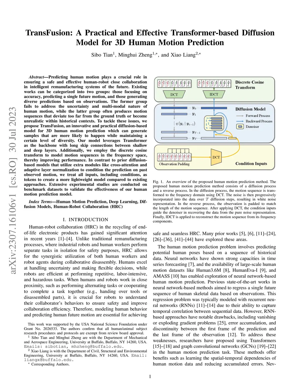 Predicting human motion plays a crucial role in ensuring a safe and effective human-robot close collaboration in intelligent remanufacturing systems of the future. Existing works can be categorized into two groups: those focusing on accuracy, predicting a single future motion, and those generating diverse predictions based on observations. The former group fails to address the uncertainty and multi-modal nature of human motion, while the latter group often produces motion sequences that deviate too far from the ground truth or become unrealistic within historical contexts. To tackle these issues, we propose TransFusion, an innovative and practical diffusion-based model for 3D human motion prediction which can generate samples that are more likely to happen while maintaining a certain level of diversity. Our model leverages Transformer as the backbone with long skip connections between shallow and deep layers. Additionally, we employ the discrete cosine transform to model motion sequences in the frequency space, thereby improving performance. In contrast to prior diffusion-based models that utilize extra modules like cross-attention and adaptive layer normalization to condition the prediction on past observed motion, we treat all inputs, including conditions, as tokens to create a more lightweight model compared to existing approaches. Extensive experimental studies are conducted on benchmark datasets to validate the effectiveness of our human motion prediction model.