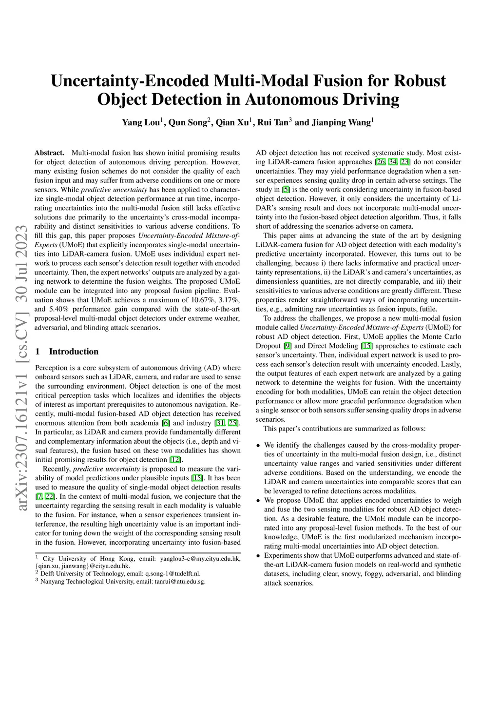 Multi-modal fusion has shown initial promising results for object detection of autonomous driving perception. However, many existing fusion schemes do not consider the quality of each fusion input and may suffer from adverse conditions on one or more sensors. While predictive uncertainty has been applied to characterize single-modal object detection performance at run time, incorporating uncertainties into the multi-modal fusion still lacks effective solutions due primarily to the uncertainty's cross-modal incomparability and distinct sensitivities to various adverse conditions. To fill this gap, this paper proposes Uncertainty-Encoded Mixture-of-Experts (UMoE) that explicitly incorporates single-modal uncertainties into LiDAR-camera fusion. UMoE uses individual expert network to process each sensor's detection result together with encoded uncertainty. Then, the expert networks' outputs are analyzed by a gating network to determine the fusion weights. The proposed UMoE module can be integrated into any proposal fusion pipeline. Evaluation shows that UMoE achieves a maximum of 10.67%, 3.17%, and 5.40% performance gain compared with the state-of-the-art proposal-level multi-modal object detectors under extreme weather, adversarial, and blinding attack scenarios.
