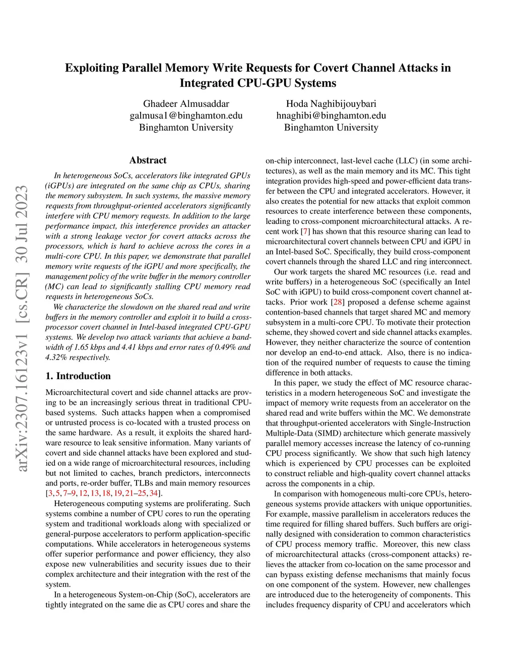 In heterogeneous SoCs, accelerators like integrated GPUs (iGPUs) are integrated on the same chip as CPUs, sharing the memory subsystem. In such systems, the massive memory requests from throughput-oriented accelerators significantly interfere with CPU memory requests. In addition to the large performance impact, this interference provides an attacker with a strong leakage vector for covert attacks across the processors, which is hard to achieve across the cores in a multi-core CPU. In this paper, we demonstrate that parallel memory write requests of the iGPU and more specifically, the management policy of the write buffer in the memory controller (MC) can lead to significantly stalling CPU memory read requests in heterogeneous SoCs. We characterize the slowdown on the shared read and write buffers in the memory controller and exploit it to build a cross-processor covert channel in Intel-based integrated CPU-GPU systems. We develop two attack variants that achieve a bandwidth of 1.65 kbps and 4.41 kbps and error rates of 0.49% and 4.32% respectively.