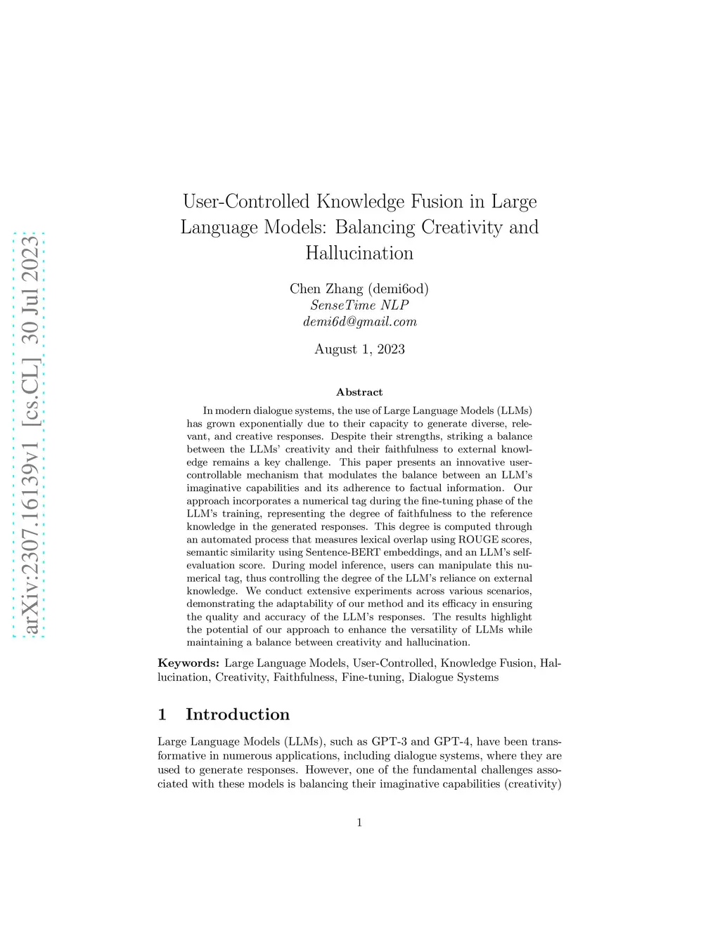 In modern dialogue systems, the use of Large Language Models (LLMs) has grown exponentially due to their capacity to generate diverse, relevant, and creative responses. Despite their strengths, striking a balance between the LLMs' creativity and their faithfulness to external knowledge remains a key challenge. This paper presents an innovative user-controllable mechanism that modulates the balance between an LLM's imaginative capabilities and its adherence to factual information. Our approach incorporates a numerical tag during the fine-tuning phase of the LLM's training, representing the degree of faithfulness to the reference knowledge in the generated responses. This degree is computed through an automated process that measures lexical overlap using ROUGE scores, semantic similarity using Sentence-BERT embeddings, and an LLM's self-evaluation score. During model inference, users can manipulate this numerical tag, thus controlling the degree of the LLM's reliance on external knowledge. We conduct extensive experiments across various scenarios, demonstrating the adaptability of our method and its efficacy in ensuring the quality and accuracy of the LLM's responses. The results highlight the potential of our approach to enhance the versatility of LLMs while maintaining a balance between creativity and hallucination.