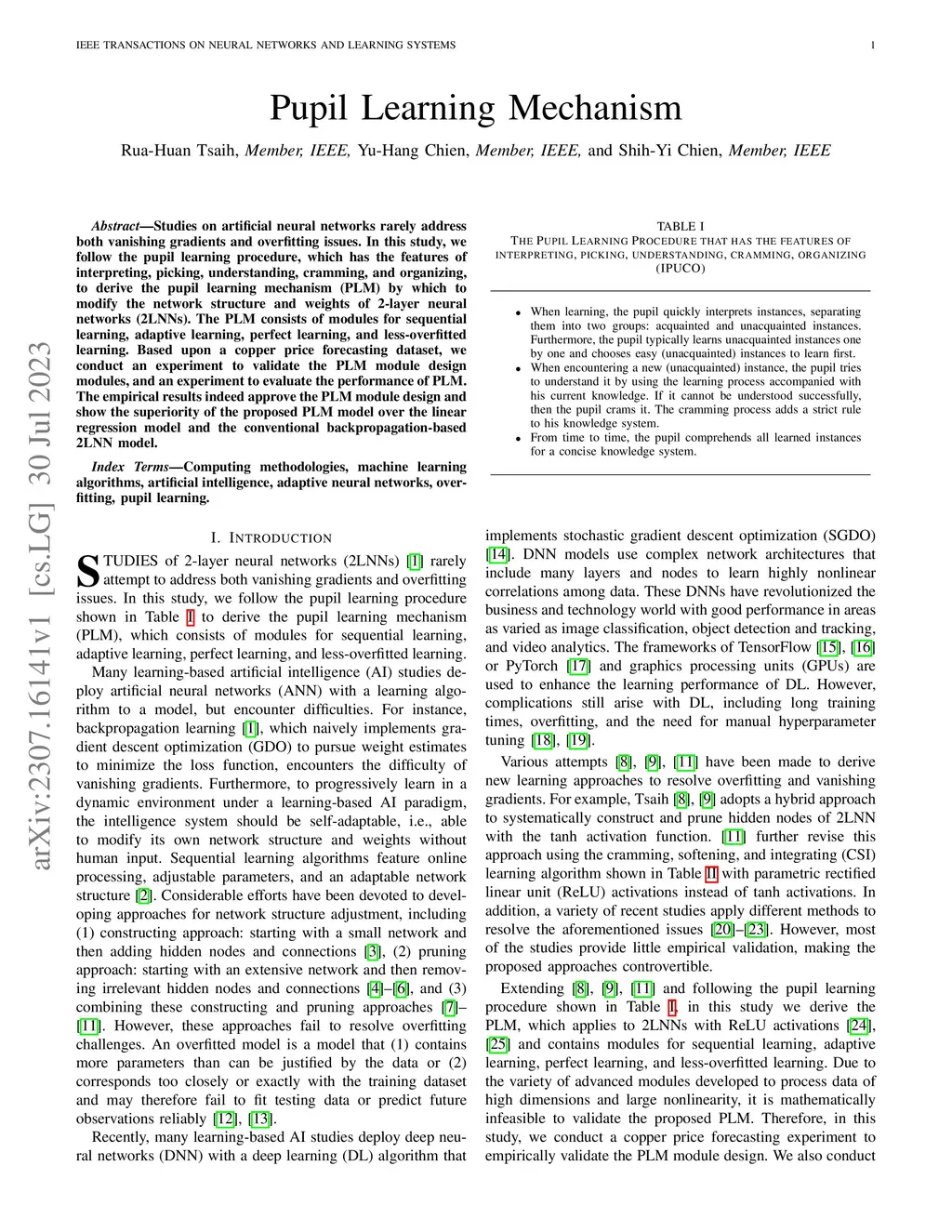 Studies on artificial neural networks rarely address both vanishing gradients and overfitting issues. In this study, we follow the pupil learning procedure, which has the features of interpreting, picking, understanding, cramming, and organizing, to derive the pupil learning mechanism (PLM) by which to modify the network structure and weights of 2-layer neural networks (2LNNs). The PLM consists of modules for sequential learning, adaptive learning, perfect learning, and less-overfitted learning. Based upon a copper price forecasting dataset, we conduct an experiment to validate the PLM module design modules, and an experiment to evaluate the performance of PLM. The empirical results indeed approve the PLM module design and show the superiority of the proposed PLM model over the linear regression model and the conventional backpropagation-based 2LNN model.
