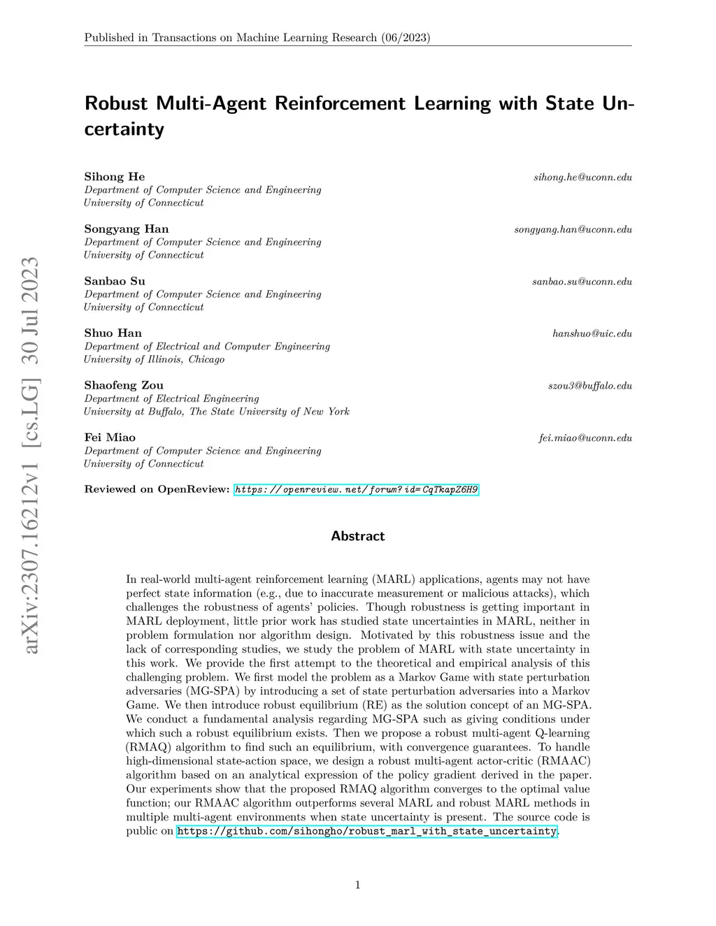 In real-world multi-agent reinforcement learning (MARL) applications, agents may not have perfect state information (e.g., due to inaccurate measurement or malicious attacks), which challenges the robustness of agents' policies. Though robustness is getting important in MARL deployment, little prior work has studied state uncertainties in MARL, neither in problem formulation nor algorithm design. Motivated by this robustness issue and the lack of corresponding studies, we study the problem of MARL with state uncertainty in this work. We provide the first attempt to the theoretical and empirical analysis of this challenging problem. We first model the problem as a Markov Game with state perturbation adversaries (MG-SPA) by introducing a set of state perturbation adversaries into a Markov Game. We then introduce robust equilibrium (RE) as the solution concept of an MG-SPA. We conduct a fundamental analysis regarding MG-SPA such as giving conditions under which such a robust equilibrium exists. Then we propose a robust multi-agent Q-learning (RMAQ) algorithm to find such an equilibrium, with convergence guarantees. To handle high-dimensional state-action space, we design a robust multi-agent actor-critic (RMAAC) algorithm based on an analytical expression of the policy gradient derived in the paper. Our experiments show that the proposed RMAQ algorithm converges to the optimal value function; our RMAAC algorithm outperforms several MARL and robust MARL methods in multiple multi-agent environments when state uncertainty is present. The source code is public on \url{https://github.com/sihongho/robust_marl_with_state_uncertainty}.