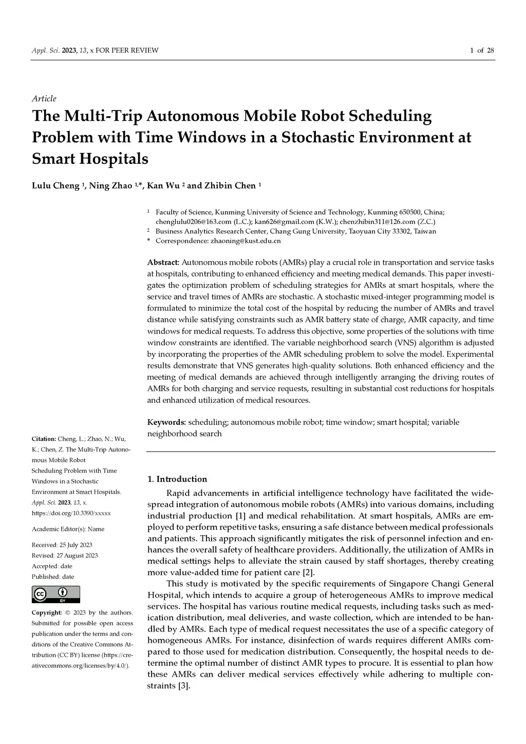 Autonomous mobile robots (AMRs) play a crucial role in transportation and service tasks at hospitals, contributing to enhanced efficiency and meeting medical demands. This paper investigates the optimization problem of scheduling strategies for AMRs at smart hospitals, where the service and travel times of AMRs are stochastic. A stochastic mixed-integer programming model is formulated to minimize the total cost of the hospital by reducing the number of AMRs and travel distance while satisfying constraints such as AMR battery state of charge, AMR capacity, and time windows for medical requests. To address this objective, some properties of the solutions with time window constraints are identified. The variable neighborhood search (VNS) algorithm is adjusted by incorporating the properties of the AMR scheduling problem to solve the model. Experimental results demonstrate that VNS generates high-quality solutions. Both enhanced efficiency and the meeting of medical demands are achieved through intelligently arranging the driving routes of AMRs for both charging and service requests, resulting in substantial cost reductions for hospitals and enhanced utilization of medical resources.