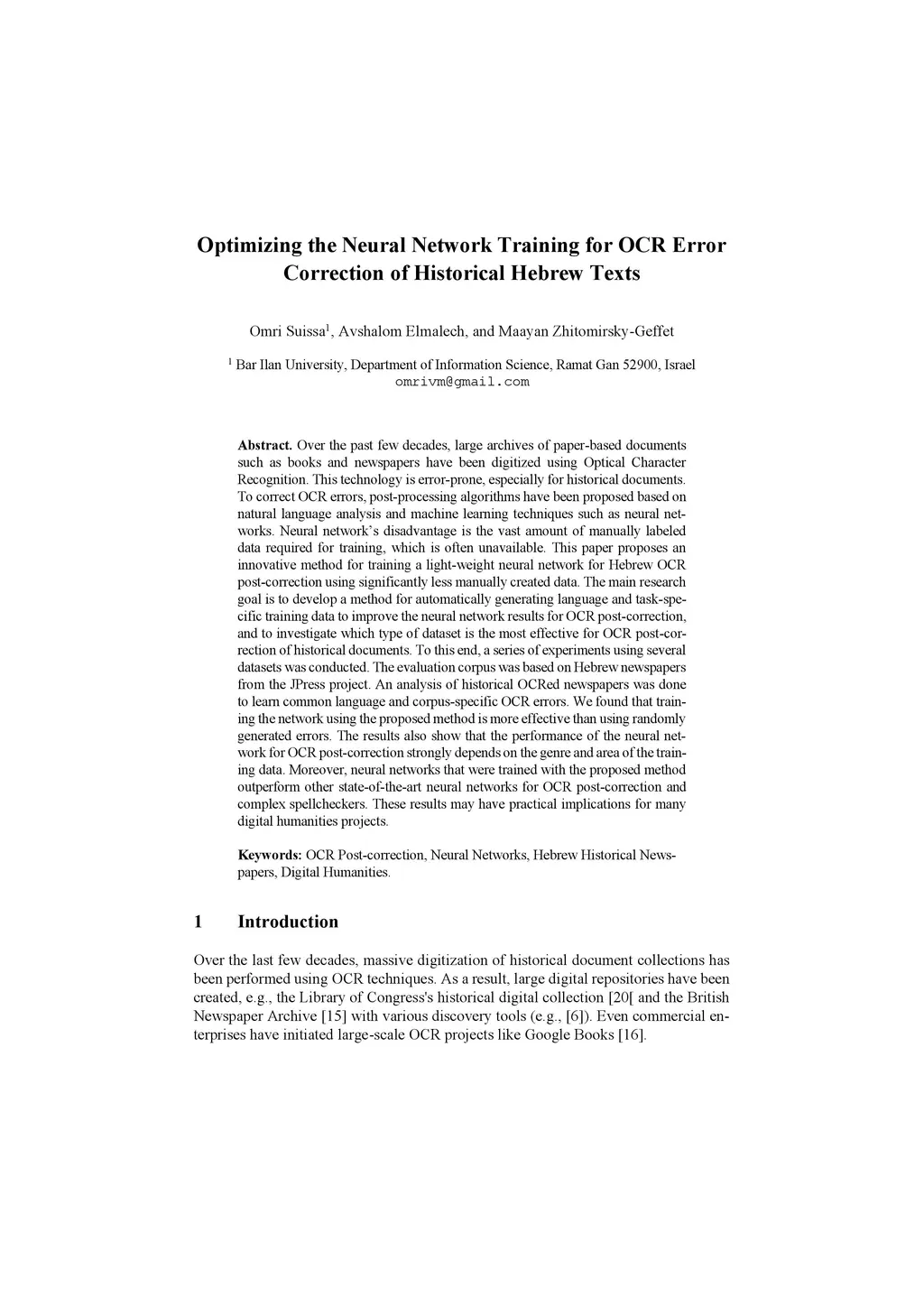 Over the past few decades, large archives of paper-based documents such as books and newspapers have been digitized using Optical Character Recognition. This technology is error-prone, especially for historical documents. To correct OCR errors, post-processing algorithms have been proposed based on natural language analysis and machine learning techniques such as neural networks. Neural network's disadvantage is the vast amount of manually labeled data required for training, which is often unavailable. This paper proposes an innovative method for training a light-weight neural network for Hebrew OCR post-correction using significantly less manually created data. The main research goal is to develop a method for automatically generating language and task-specific training data to improve the neural network results for OCR post-correction, and to investigate which type of dataset is the most effective for OCR post-correction of historical documents. To this end, a series of experiments using several datasets was conducted. The evaluation corpus was based on Hebrew newspapers from the JPress project. An analysis of historical OCRed newspapers was done to learn common language and corpus-specific OCR errors. We found that training the network using the proposed method is more effective than using randomly generated errors. The results also show that the performance of the neural network for OCR post-correction strongly depends on the genre and area of the training data. Moreover, neural networks that were trained with the proposed method outperform other state-of-the-art neural networks for OCR post-correction and complex spellcheckers. These results may have practical implications for many digital humanities projects.