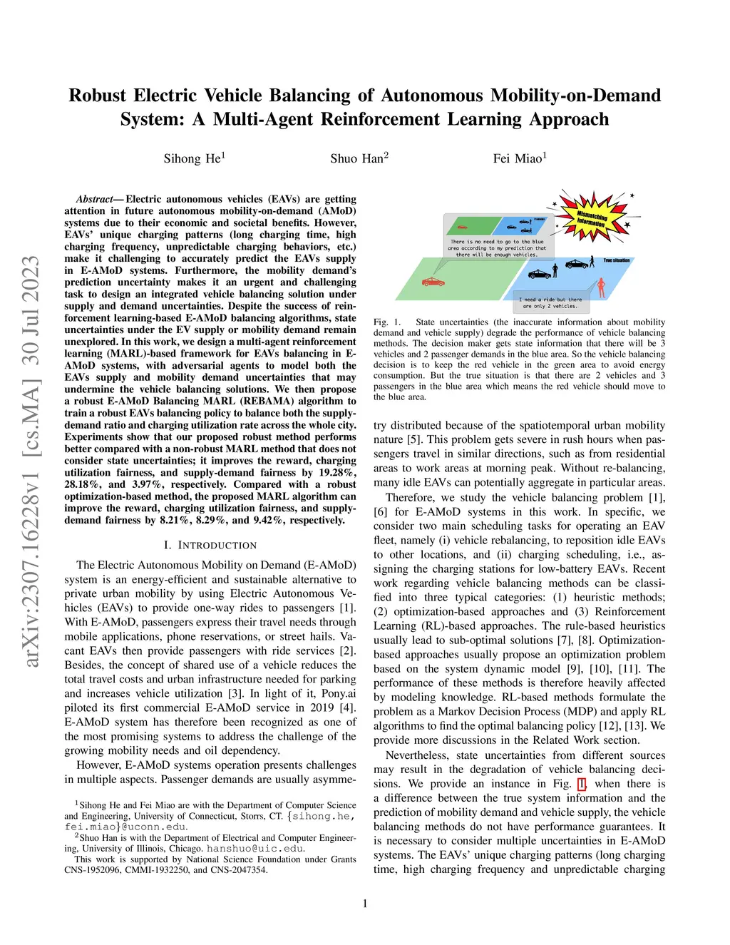 Electric autonomous vehicles (EAVs) are getting attention in future autonomous mobility-on-demand (AMoD) systems due to their economic and societal benefits. However, EAVs' unique charging patterns (long charging time, high charging frequency, unpredictable charging behaviors, etc.) make it challenging to accurately predict the EAVs supply in E-AMoD systems. Furthermore, the mobility demand's prediction uncertainty makes it an urgent and challenging task to design an integrated vehicle balancing solution under supply and demand uncertainties. Despite the success of reinforcement learning-based E-AMoD balancing algorithms, state uncertainties under the EV supply or mobility demand remain unexplored. In this work, we design a multi-agent reinforcement learning (MARL)-based framework for EAVs balancing in E-AMoD systems, with adversarial agents to model both the EAVs supply and mobility demand uncertainties that may undermine the vehicle balancing solutions. We then propose a robust E-AMoD Balancing MARL (REBAMA) algorithm to train a robust EAVs balancing policy to balance both the supply-demand ratio and charging utilization rate across the whole city. Experiments show that our proposed robust method performs better compared with a non-robust MARL method that does not consider state uncertainties; it improves the reward, charging utilization fairness, and supply-demand fairness by 19.28%, 28.18%, and 3.97%, respectively. Compared with a robust optimization-based method, the proposed MARL algorithm can improve the reward, charging utilization fairness, and supply-demand fairness by 8.21%, 8.29%, and 9.42%, respectively.