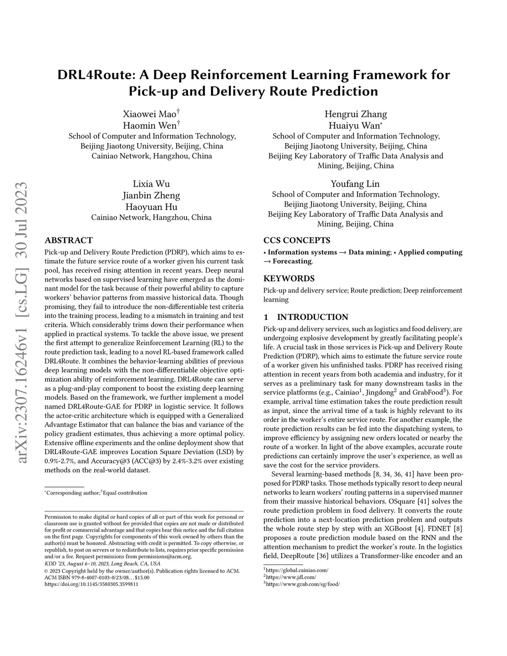 DRL4Route: A Deep Reinforcement Learning Framework for Pick-up and