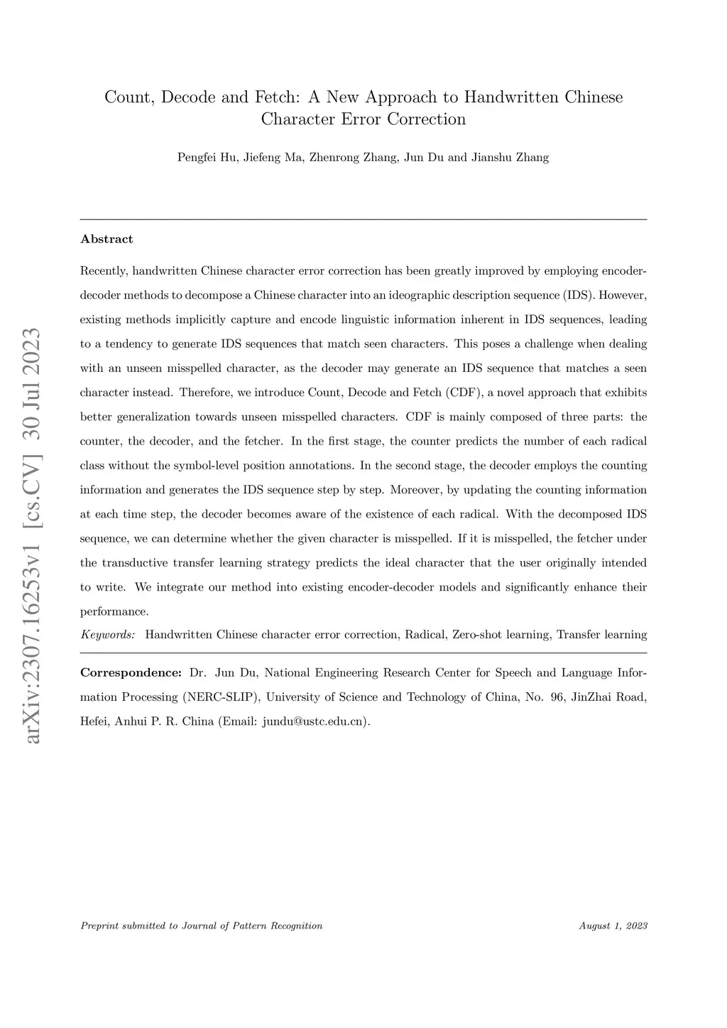 Recently, handwritten Chinese character error correction has been greatly improved by employing encoder-decoder methods to decompose a Chinese character into an ideographic description sequence (IDS). However, existing methods implicitly capture and encode linguistic information inherent in IDS sequences, leading to a tendency to generate IDS sequences that match seen characters. This poses a challenge when dealing with an unseen misspelled character, as the decoder may generate an IDS sequence that matches a seen character instead. Therefore, we introduce Count, Decode and Fetch (CDF), a novel approach that exhibits better generalization towards unseen misspelled characters. CDF is mainly composed of three parts: the counter, the decoder, and the fetcher. In the first stage, the counter predicts the number of each radical class without the symbol-level position annotations. In the second stage, the decoder employs the counting information and generates the IDS sequence step by step. Moreover, by updating the counting information at each time step, the decoder becomes aware of the existence of each radical. With the decomposed IDS sequence, we can determine whether the given character is misspelled. If it is misspelled, the fetcher under the transductive transfer learning strategy predicts the ideal character that the user originally intended to write. We integrate our method into existing encoder-decoder models and significantly enhance their performance.