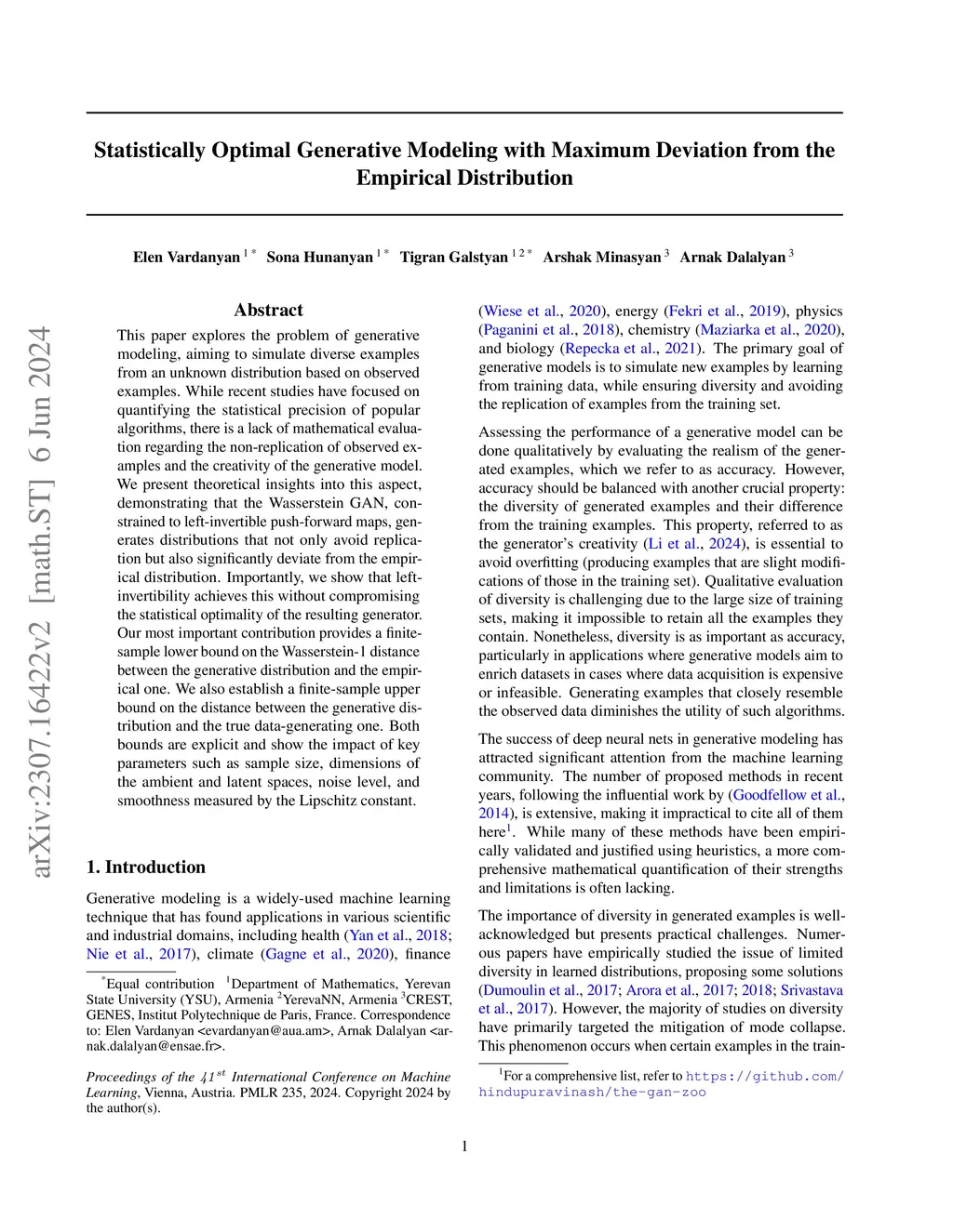 This paper explores the problem of generative modeling, aiming to simulate diverse examples from an unknown distribution based on observed examples. While recent studies have focused on quantifying the statistical precision of popular algorithms, there is a lack of mathematical evaluation regarding the non-replication of observed examples and the creativity of the generative model. We present theoretical insights into this aspect, demonstrating that the Wasserstein GAN, constrained to left-invertible push-forward maps, generates distributions that avoid replication and significantly deviate from the empirical distribution. Importantly, we show that left-invertibility achieves this without compromising the statistical optimality of the resulting generator. Our most important contribution provides a finite-sample lower bound on the Wasserstein-1 distance between the generative distribution and the empirical one. We also establish a finite-sample upper bound on the distance between the generative distribution and the true data-generating one. Both bounds are explicit and show the impact of key parameters such as sample size, dimensions of the ambient and latent spaces, noise level, and smoothness measured by the Lipschitz constant.