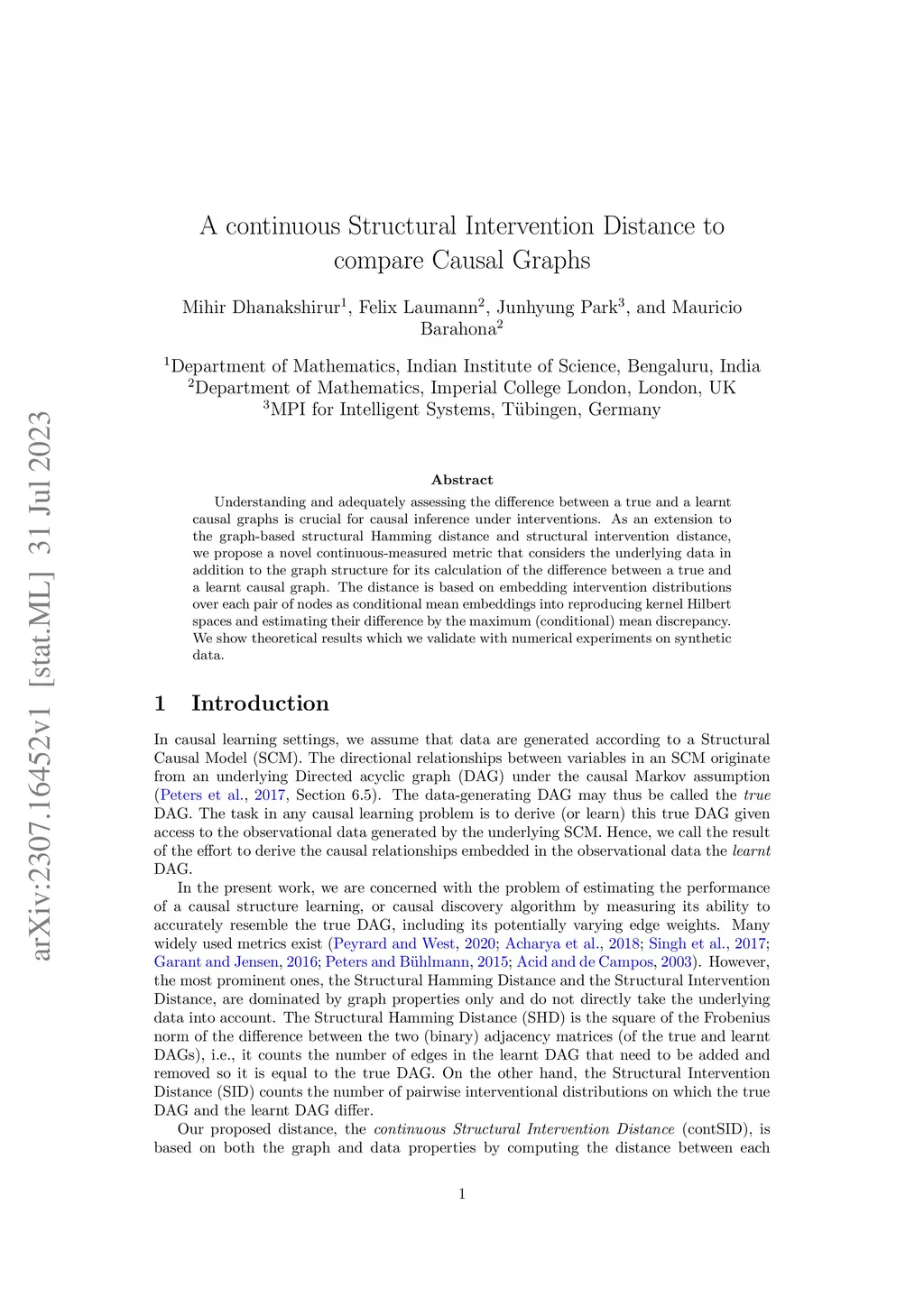 Understanding and adequately assessing the difference between a true and a learnt causal graphs is crucial for causal inference under interventions. As an extension to the graph-based structural Hamming distance and structural intervention distance, we propose a novel continuous-measured metric that considers the underlying data in addition to the graph structure for its calculation of the difference between a true and a learnt causal graph. The distance is based on embedding intervention distributions over each pair of nodes as conditional mean embeddings into reproducing kernel Hilbert spaces and estimating their difference by the maximum (conditional) mean discrepancy. We show theoretical results which we validate with numerical experiments on synthetic data.
