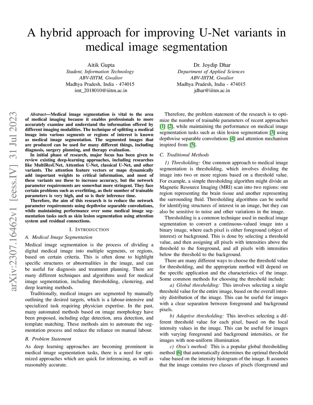 Medical image segmentation is vital to the area of medical imaging because it enables professionals to more accurately examine and understand the information offered by different imaging modalities. The technique of splitting a medical image into various segments or regions of interest is known as medical image segmentation. The segmented images that are produced can be used for many different things, including diagnosis, surgery planning, and therapy evaluation. In initial phase of research, major focus has been given to review existing deep-learning approaches, including researches like MultiResUNet, Attention U-Net, classical U-Net, and other variants. The attention feature vectors or maps dynamically add important weights to critical information, and most of these variants use these to increase accuracy, but the network parameter requirements are somewhat more stringent. They face certain problems such as overfitting, as their number of trainable parameters is very high, and so is their inference time. Therefore, the aim of this research is to reduce the network parameter requirements using depthwise separable convolutions, while maintaining performance over some medical image segmentation tasks such as skin lesion segmentation using attention system and residual connections.