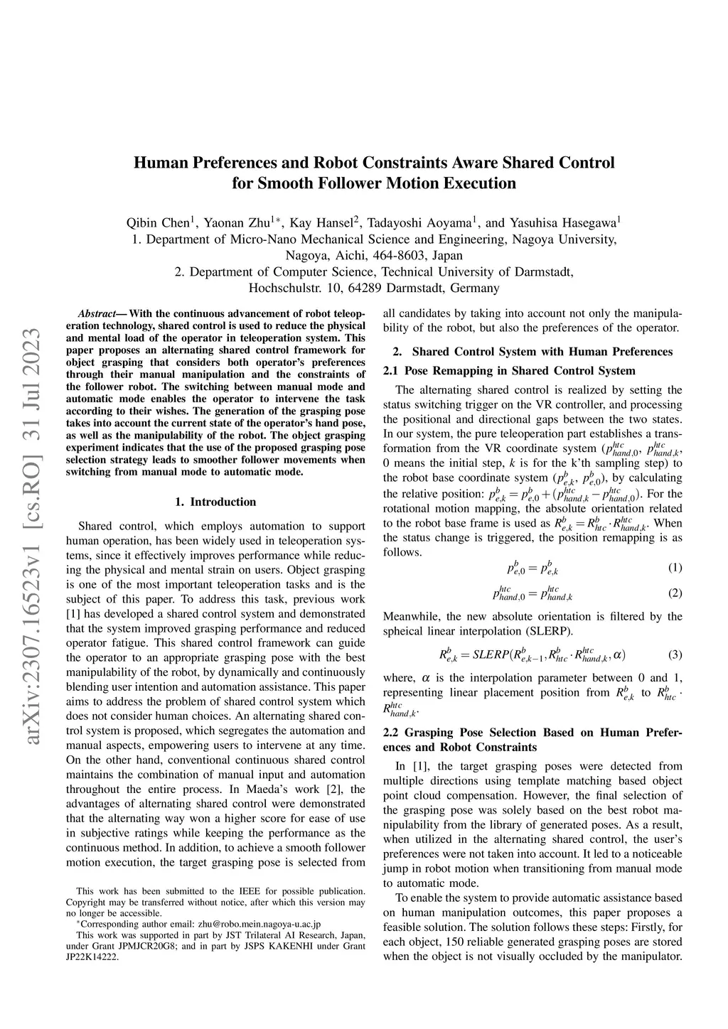 With the continuous advancement of robot teleoperation technology, shared control is used to reduce the physical and mental load of the operator in teleoperation system. This paper proposes an alternating shared control framework for object grasping that considers both operator's preferences through their manual manipulation and the constraints of the follower robot. The switching between manual mode and automatic mode enables the operator to intervene the task according to their wishes. The generation of the grasping pose takes into account the current state of the operator's hand pose, as well as the manipulability of the robot. The object grasping experiment indicates that the use of the proposed grasping pose selection strategy leads to smoother follower movements when switching from manual mode to automatic mode.