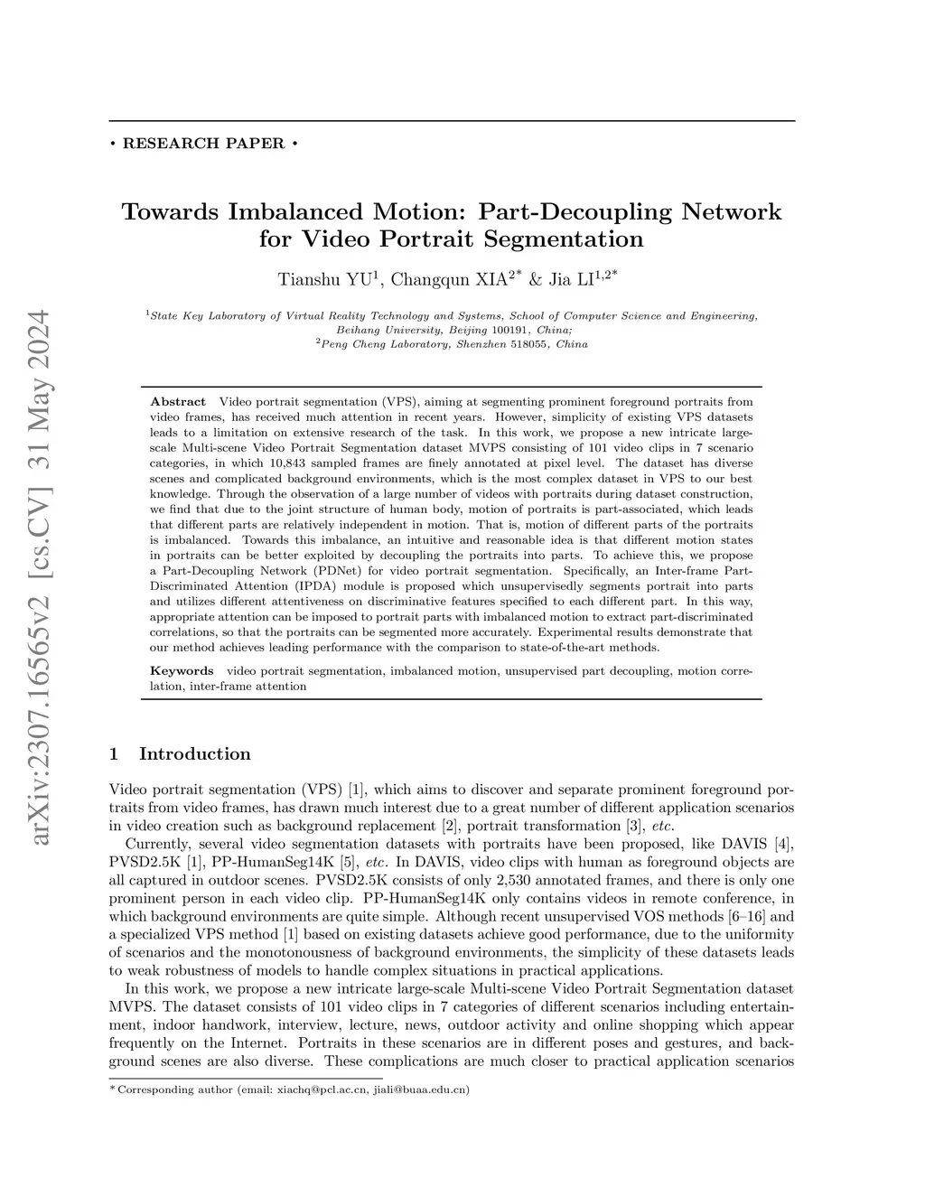 Video portrait segmentation (VPS), aiming at segmenting prominent foreground portraits from video frames, has received much attention in recent years. However, simplicity of existing VPS datasets leads to a limitation on extensive research of the task. In this work, we propose a new intricate large-scale Multi-scene Video Portrait Segmentation dataset MVPS consisting of 101 video clips in 7 scenario categories, in which 10,843 sampled frames are finely annotated at pixel level. The dataset has diverse scenes and complicated background environments, which is the most complex dataset in VPS to our best knowledge. Through the observation of a large number of videos with portraits during dataset construction, we find that due to the joint structure of human body, motion of portraits is part-associated, which leads that different parts are relatively independent in motion. That is, motion of different parts of the portraits is imbalanced. Towards this imbalance, an intuitive and reasonable idea is that different motion states in portraits can be better exploited by decoupling the portraits into parts. To achieve this, we propose a Part-Decoupling Network (PDNet) for video portrait segmentation. Specifically, an Inter-frame Part-Discriminated Attention (IPDA) module is proposed which unsupervisedly segments portrait into parts and utilizes different attentiveness on discriminative features specified to each different part. In this way, appropriate attention can be imposed to portrait parts with imbalanced motion to extract part-discriminated correlations, so that the portraits can be segmented more accurately. Experimental results demonstrate that our method achieves leading performance with the comparison to state-of-the-art methods.
