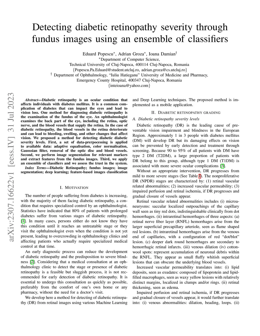 Diabetic retinopathy is an ocular condition that affects individuals with diabetes mellitus. It is a common complication of diabetes that can impact the eyes and lead to vision loss. One method for diagnosing diabetic retinopathy is the examination of the fundus of the eye. An ophthalmologist examines the back part of the eye, including the retina, optic nerve, and the blood vessels that supply the retina. In the case of diabetic retinopathy, the blood vessels in the retina deteriorate and can lead to bleeding, swelling, and other changes that affect vision. We proposed a method for detecting diabetic diabetic severity levels. First, a set of data-prerpocessing is applied to available data: adaptive equalisation, color normalisation, Gaussian filter, removal of the optic disc and blood vessels. Second, we perform image segmentation for relevant markers and extract features from the fundus images. Third, we apply an ensemble of classifiers and we assess the trust in the system.