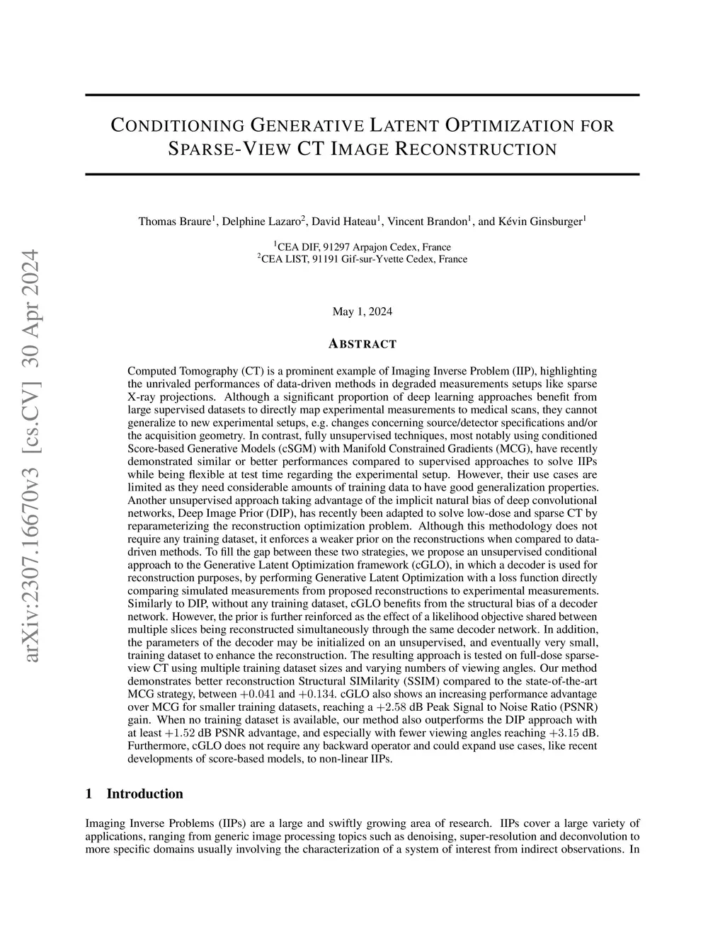 Computed Tomography (CT) is a prominent example of Imaging Inverse Problem highlighting the unrivaled performances of data-driven methods in degraded measurements setups like sparse X-ray projections. Although a significant proportion of deep learning approaches benefit from large supervised datasets, they cannot generalize to new experimental setups. In contrast, fully unsupervised techniques, most notably using score-based generative models, have recently demonstrated similar or better performances compared to supervised approaches while being flexible at test time. However, their use cases are limited as they need considerable amounts of training data to have good generalization properties. Another unsupervised approach taking advantage of the implicit natural bias of deep convolutional networks, Deep Image Prior, has recently been adapted to solve sparse CT by reparameterizing the reconstruction problem. Although this methodology does not require any training dataset, it enforces a weaker prior on the reconstructions when compared to data-driven methods. To fill the gap between these two strategies, we propose an unsupervised conditional approach to the Generative Latent Optimization framework (cGLO). Similarly to DIP, without any training dataset, cGLO benefits from the structural bias of a decoder network. However, the prior is further reinforced as the effect of a likelihood objective shared between multiple slices being reconstructed simultaneously through the same decoder network. In addition, the parameters of the decoder may be initialized on an unsupervised, and eventually very small, training dataset to enhance the reconstruction. The resulting approach is tested on full-dose sparse-view CT using multiple training dataset sizes and varying numbers of viewing angles.