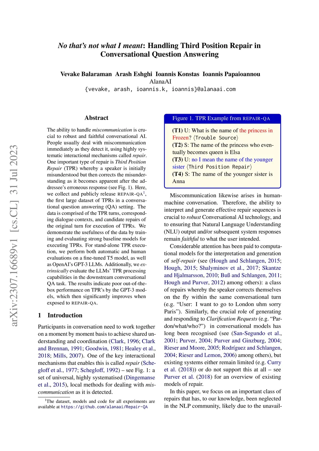 The ability to handle miscommunication is crucial to robust and faithful conversational AI. People usually deal with miscommunication immediately as they detect it, using highly systematic interactional mechanisms called repair. One important type of repair is Third Position Repair (TPR) whereby a speaker is initially misunderstood but then corrects the misunderstanding as it becomes apparent after the addressee's erroneous response. Here, we collect and publicly release Repair-QA, the first large dataset of TPRs in a conversational question answering (QA) setting. The data is comprised of the TPR turns, corresponding dialogue contexts, and candidate repairs of the original turn for execution of TPRs. We demonstrate the usefulness of the data by training and evaluating strong baseline models for executing TPRs. For stand-alone TPR execution, we perform both automatic and human evaluations on a fine-tuned T5 model, as well as OpenAI's GPT-3 LLMs. Additionally, we extrinsically evaluate the LLMs' TPR processing capabilities in the downstream conversational QA task. The results indicate poor out-of-the-box performance on TPR's by the GPT-3 models, which then significantly improves when exposed to Repair-QA.