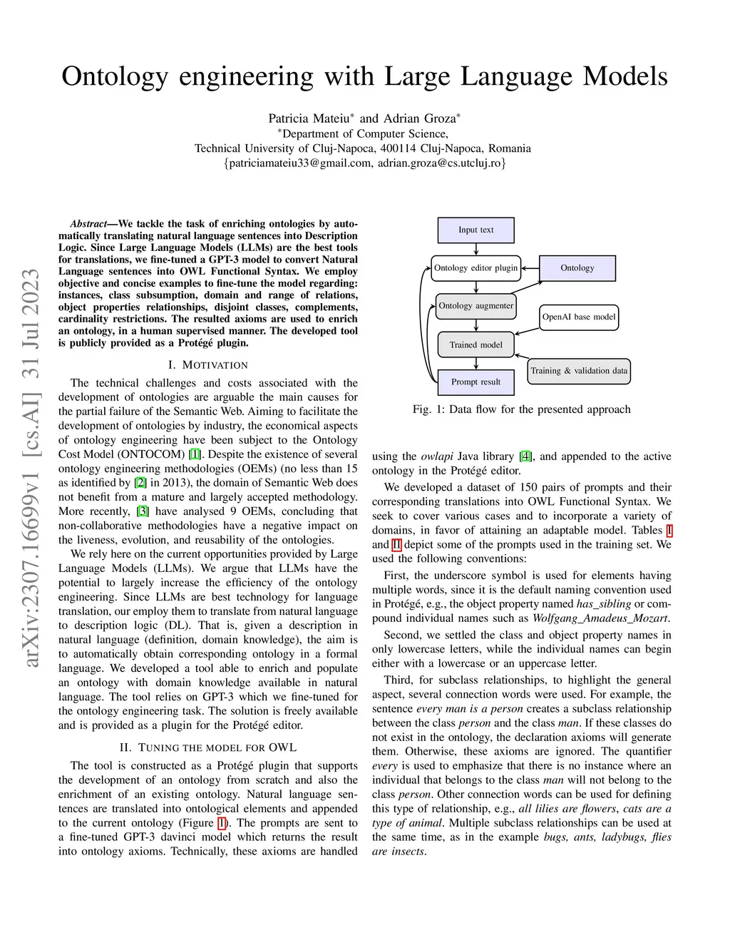 We tackle the task of enriching ontologies by automatically translating natural language sentences into Description Logic. Since Large Language Models (LLMs) are the best tools for translations, we fine-tuned a GPT-3 model to convert Natural Language sentences into OWL Functional Syntax. We employ objective and concise examples to fine-tune the model regarding: instances, class subsumption, domain and range of relations, object properties relationships, disjoint classes, complements, cardinality restrictions. The resulted axioms are used to enrich an ontology, in a human supervised manner. The developed tool is publicly provided as a Protge plugin.