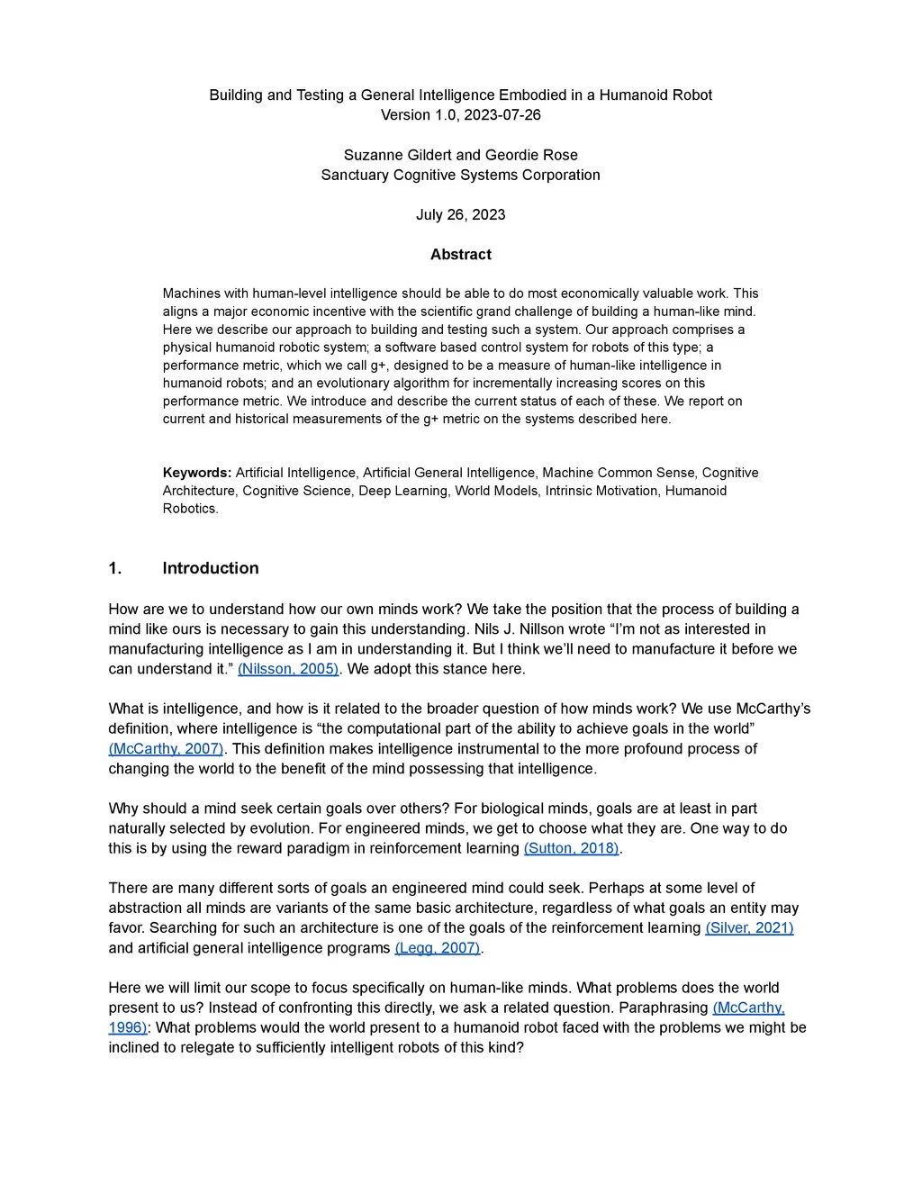 Machines with human-level intelligence should be able to do most economically valuable work. This aligns a major economic incentive with the scientific grand challenge of building a human-like mind. Here we describe our approach to building and testing such a system. Our approach comprises a physical humanoid robotic system; a software based control system for robots of this type; a performance metric, which we call g+, designed to be a measure of human-like intelligence in humanoid robots; and an evolutionary algorithm for incrementally increasing scores on this performance metric. We introduce and describe the current status of each of these. We report on current and historical measurements of the g+ metric on the systems described here.