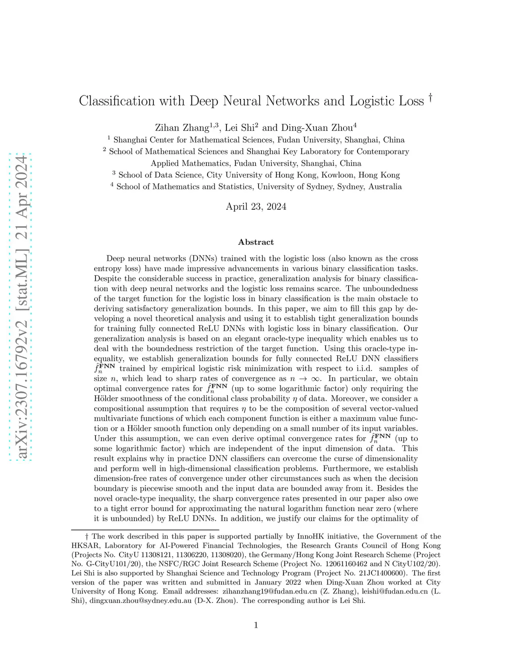 Deep neural networks (DNNs) trained with the logistic loss (i.e., the cross entropy loss) have made impressive advancements in various binary classification tasks. However, generalization analysis for binary classification with DNNs and logistic loss remains scarce. The unboundedness of the target function for the logistic loss is the main obstacle to deriving satisfactory generalization bounds. In this paper, we aim to fill this gap by establishing a novel and elegant oracle-type inequality, which enables us to deal with the boundedness restriction of the target function, and using it to derive sharp convergence rates for fully connected ReLU DNN classifiers trained with logistic loss. In particular, we obtain optimal convergence rates (up to log factors) only requiring the H\"older smoothness of the conditional class probability of data. Moreover, we consider a compositional assumption that requires to be the composition of several vector-valued functions of which each component function is either a maximum value function or a H\"older smooth function only depending on a small number of its input variables. Under this assumption, we derive optimal convergence rates (up to log factors) which are independent of the input dimension of data. This result explains why DNN classifiers can perform well in practical high-dimensional classification problems. Besides the novel oracle-type inequality, the sharp convergence rates given in our paper also owe to a tight error bound for approximating the natural logarithm function near zero (where it is unbounded) by ReLU DNNs. In addition, we justify our claims for the optimality of rates by proving corresponding minimax lower bounds. All these results are new in the literature and will deepen our theoretical understanding of classification with DNNs.